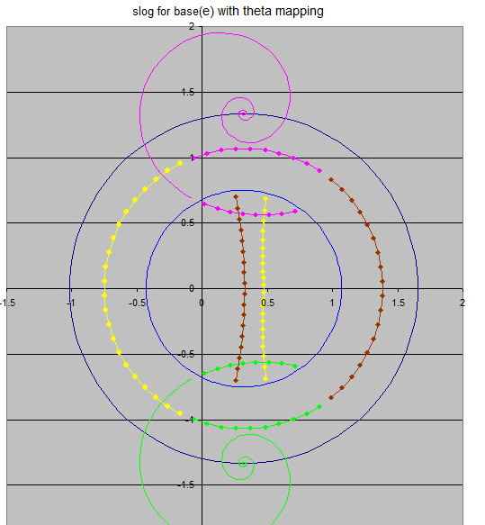 RE: new fatou.gp program - sheldonison - 07/18/2019 (07/18/2019, 11:52 AM)bo198214 Wrote: Hey Sheldon, just want to say how amazed I am how extensively you developed your program, including the findings of Ecalle and the perturbed Fatou coordinates, while I was absent. Perhaps later I will ask some question about the analytic continuation of the base, which still puzzles me. Meanwhile I will read your fatou.gp to finally understand, what you are doing there Thanks Henryk. I wanted to prove fatou would converge, but I hit interesting roadblocks when I try. Here is a base(e) picture showing 60 sample points, and the correspondence. I don't remember where I posted this before, but it belongs in this thread. You can run sexpinit(exp(1)) which iterates, but you can also solve a linear system of equations, which works equally well, but you need to know how many samples you want for the theta mapping ahead of time, and its generally extra work, but I think more interesting for understanding how the program works. matrix_ir(1,60,8 ) also solves slog base(e). With 60 sample points, the precision is good for about 12 digits of precision with 61 terms in the Taylor series ranging from x^1, to x^60. For the system of equations, or the iterative solution, the constant term is required to be zero. Anyway, the points in yellow on the middle circle border are paired up with their exponent in yellow in the inner circle. The points in brown are paired up with their logarithm in the inner circle. The points in pink in the inner circle (and green for the conjugate) are used to tell the regular slog's Abel function what its theta mapping is. Here, alpha_u is the upper abel function from the logarithm of the Schroeder equation, and theta_u is the theta mapping. That is used to define the points in pink (and green) in the middle circle. Solve the system of equations, or iterate adding sample points as you go, and you are solving this picture, as the number of sample points goes to infinity. Here, all the points are paired up with data points in a smaller radius circle, so the high frequency components aren't as relevant and the solution is both linear and very stable. The same is true of the theta mappings. For Kneser's slog, there is a complex valued inverse superfunction in the upper half of complex plane, and another in the lower half of the complex plane, generated from the formal Schroder function which my program generates. \( \alpha_u=\frac{\ln(\psi(z))}{\ln(\lambda)};\;\;\lambda=L;\;\; \) for base_e lambda=L \( \alpha_r(z)=\alpha_u(z)+\theta_u(\alpha_u(z));\;\; \) real valued Abel function via 1-cyclic theta mapping \( \alpha_r(z)=\frac{\ln(z-L_1)}{\ln(\lambda_1)} + \frac{\ln(z-L_2)}{\ln(\lambda_2)} + p(z)\;\; \) real valued abel function via Taylor series p(z) centered between fixed points \( \text{slog}(z)=\alpha_r(z)-\alpha_r(1) \) I have lots more charts I could post as time permits. The algorithm works for lots of repelling and attracting complex bases, as long as they're not on the Shell Thron boundary or have a period too close to pseudo period-2, but you can get really close to the boundary and it still works, just a little slower. RE: new fatou.gp program - Ember Edison - 07/22/2019 (08/08/2017, 12:32 AM)sheldonison Wrote: I posted a new version of fatou.gp; to download, see the first post. The most important addition to the program is a routine called "matrix_ir(k,n,m), where k is log(log(B))+1 if B is the tetration base. Internally, fatou iterates exp(z)-1+k near the parabolic fixed point. The matrix_ir routine solves a matrix equivalent to finding a solution on n sample points that matches exactly with the theta approximation, or abel(f(z))-1 or abel(finv(z))+1. The sexpinit(B) is still 2-2.5x faster than the matrix solution on average, but for some complicated complex bases, the times are closer. I also added loop1(n), which is used after loop(k) to keep iterating the loop solution without adding any additional sample points. Then loop1 will converge to the exact same solution as matrix_ir generates! I will add more details later on the matrix_ir solution, and how it samples a set of points to get the exact same kind of convergence as sexpinit/loop. And only for sexp. The real bases for slog not support >= 5. (I believe this value, base = 4.968 test pass) Code: sexpinit(5);slog(-0.015 - 8*I)RE: new fatou.gp program - sheldonison - 07/27/2019 (07/22/2019, 11:56 PM)Ember Edison Wrote: ... Thanks for testing Ember;I fixed the typo in the pari-gp code for fatou.gp. It was missing a check for complextaylor before calling the isuperf2 routine. It is fixed now. Sorry for the delay; things have been very very busy for me. If a base ia real valued, this routine isn't generated for the lower half of the complex plane. Apparently, this particular piece of code isn't used much in the slog routine. - Sheldon RE: new fatou.gp program - Ember Edison - 07/29/2019 (07/27/2019, 07:38 AM)sheldonison Wrote:Sorry, but please test it:(07/22/2019, 11:56 PM)Ember Edison Wrote: ... Code: sexpinit(32000*(-1)^(1/30))RE: new fatou.gp program - sheldonison - 08/14/2019 (07/29/2019, 10:35 AM)Ember Edison Wrote: Sorry, but please test it: I updated the main fatou.gp code to include the more resilient matrix version from Ember's post. But matrix_ir doesn't know how many theta sample points to use and defaults to 18 theta samples sexpinit(B) is still the suggested version to use for generic real and complex bases, which loops, increasing precision at each iteration instead of using the matrix version of the same solution family. So if you have a base that gives errors or for sexpinit(B) ....matrix_ir(B,lctr,ltht,myctr,myir); /* B is now the tetration base, instead of the internally used k=log(log(B))+1 */ lctr is the number of sample points in the slog Taylor series ltht is the number of sample points in the theta mapping; defaults to 18 myctr is sampling radius ratio. myir is the inner radius radio with respect to the sa
