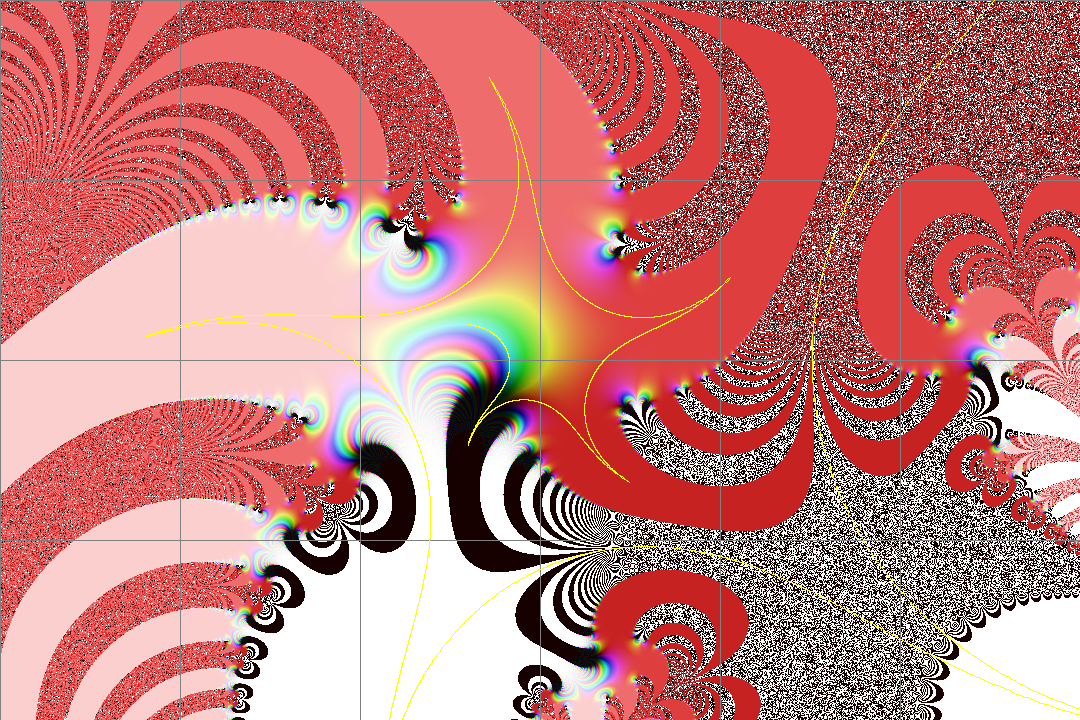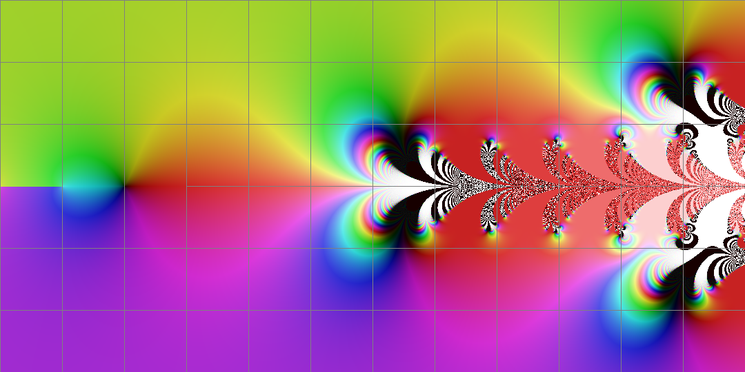 Pictures of the Chi-Star - sheldonison - 05/28/2017 Some number of years ago in 2011, I made some complex plane graphs of the inverse Schröder function super-imposed with Kneser's Chi-star function, but it turns out I never posted them online since I skipped right to the complex valued superfunction instead; http://math.eretrandre.org/tetrationforum/showthread.php?tid=700&pid=6193#pid6193 Working directly with the Schröder and Chi-star function is probably more mathematically accessible. So I thought I would put together a post with some pretty pictures of Kneser's Chi-star function. Let's start with the \( \Psi \) (or Schröder function) for exp(z) developed at the complex fixed point, L~=0.318132 + 1.33724i; where exp(L)=L, and the multiplier \( \lambda \) at the fixed point is also L since \( \exp(L+\delta)\approx L+L\cdot\delta \Rightarrow\;\lambda=L \) The defining equation for the Schröder function is \( \Psi(e^z) = \lambda\cdot \Psi(z) \). Remarkably, this function maps iterated exponentiation base e to multiplication by \( \lambda \). Of course \( \Psi(0) \) has what turns out to be a really complicated singularity. Kneser's Chi-Star \( \chi(z) \) function maps the Schröder \( \Psi \) function of the real number line to get the Chi-star function. \( \chi(z)=\Psi\circ\Re\;\; \) This is the Schröder of the real number line. It is also probably the most natural first step in generating analytic real valued Tetration. And it is a very pretty function. From the definition of the \( \Psi \) then \( \chi(e^z)=\lambda\cdot\chi(z) \) The first pretty picture I'm posting is the inverse Schröder \( \Psi^{-1}(z) \), covering the range of \( \pm 30 ... \pm 20i \), and superimposed with Kneser's Chi-star \( \chi(z) \) function. Of course, its difficult to grasp the details of this pretty picture. Lets start with the definition. Normally, one generates the Taylor series coefficients of the \( \Psi^{-1}(z) \) function iteratively; I usually work with numerical values of the coefficients. For reference, I include the closed form for the z^2 coefficient. It is an entire function. \( \Psi^{-1}(\lambda z)=\exp(\Psi^{-1}(z))\;\;\;\Psi^{-1}(z)\approx \lambda+z+\frac{0.5z^2}{\lambda-1}+O(z^3)\;\;\; \) This is the function in the complex plane graph picture below. Here is another image that serves as a "key" to what the yellow segment superimposed on the picture above refers to. You can see that where the green curve approximately meets the red curve is approximately zero. Actually, the green segment ends at approximately -10^-78, and the red segment starts at +10^-78, and then the red segment continues until approximately 1-10^-78. Of course, there is a singularity at 0, so we can't extend the picture all the way to exactly zero! There is also a singularity at 1. And a singularity at e, and a singularity at \( e^{e} \) and a singularity at \( e^{e^e} \).... The Chi-star contour in the images covers roughly -infinity to Tet(6). Each time you iterate exp(x), you jump to a new curved segment that is L times larger than the segment containing x. Below, I show eight segments of the Chi-Star. If you could figure out how to map the various segments of the Chi-Star back to the real axis of the iterated Tetration function, then you would have a mathematical way to generate Tetration. The next step in that process is to generate a superfunction for exp base e by taking \( \Psi^{-1}(\lambda^z)\; \) But this superfunction is not real valued at the real axis due to the singularities at \( \Psi(\exp^{\circ n} (0)) \). But back to the Chi-star itself. Let's look at the singularity near zero. Can you guess where the singularity would extend to if we got even closer to zero? Here, I extended the section near zero to +/- 1/Tet(5.5). Notice that the red and green segments continue almost exactly together until perhaps surprisingly, they run almost coincident with the Tet(4..5) segment. But then they make a soft u-turn, near 1/Tet(5), and then join up with the Tet(5..6) segment! Black in these complex plane graphs corresponds to zero, so wherever it goes, it would be "black" in the complex plane graph of the \( \Psi^{-1} \) function. Eventually, you get the checkerboard pattern where the black and the white are right next to each other. But the soft turnaround occurs where the function is still black. The full image with the Chi-Star singularity extended as far as it can go is too busy to see the "star" in the Chi-Star. I included the lower-right corner from the first image, with the soft turnaround near 1/Tet(5), where the function is near a singularity for Tet(5). \( \ln(\ln(\frac{1}{\text{Tet(5)}}))=\text{Tet}(3)+\pi i \) This compares with Tet(3)=3814279, where \( \Psi(\text{Tet(3)}) \) is a true singularity but \( \Psi(\text{Tet}(3)+\pi i) \) is only near the singularity. So we get this turnaround where the true singularity continues on. RE: Pictures of the Chi-Star - JmsNxn - 05/28/2017 Very pretty pictures. I thought I might add an interesting quip about how to calculate this complex super function. I recently ran into this formula working on difference equations, and it turned out to be equivalent to solving for super functions. (Funny how the brain works, when working on two entirely different problems, they happen to be intensely related.) Define the sequence \( \zeta_n = \Psi^{-1}(e^{-n} \Psi(x_0)) \) where \( x_0 \) is fixed and is arbitrary, so long as \( \log^{\circ n}(x_0) \to L \). We can write an entire super function of exponentiation as \( F(z)=\frac{1}{\Gamma(Lz)} (\sum_{n=0}^\infty \zeta_n \frac{(-1)^n}{n!(n+Lz)} + \int_1^\infty (\sum_{n=0}^\infty \zeta_n \frac{(-t)^n}{n!})t^{Lz-1}\,dt) \) This expression converges FOR ALL complex values, which is REAL nice. Naturally \( e^{F(z)} = F(z+1) \), but \( F(z) \neq 0 \), and is not real valued on the real line. I have equally so been wondering if this can somehow be morphed into a solution to tetration, but no luck so far. I'm still a little lost abou