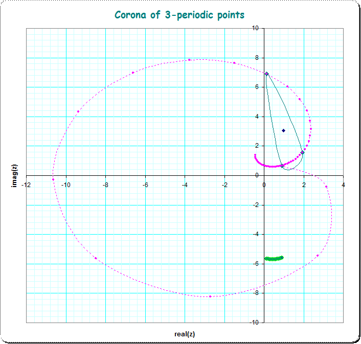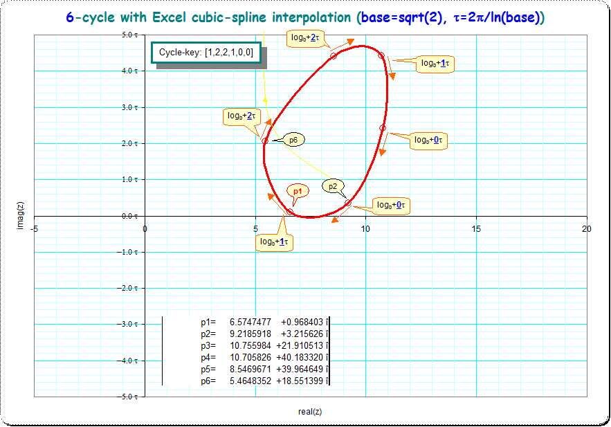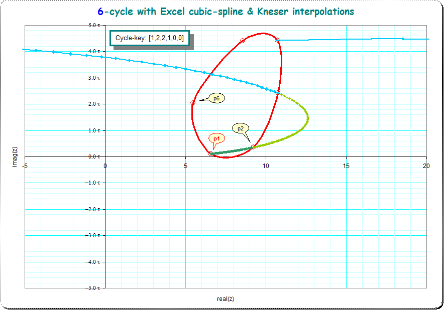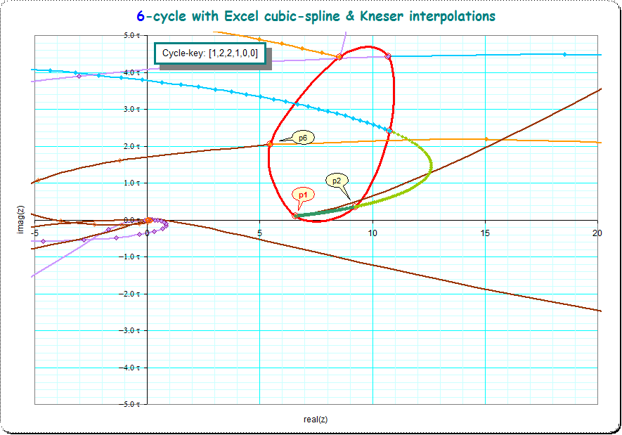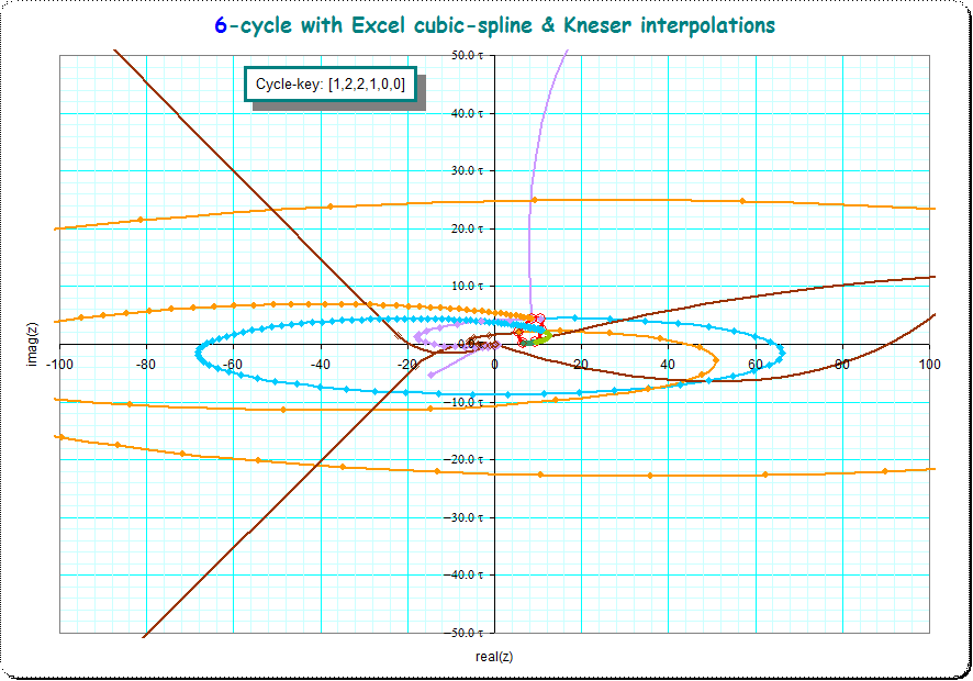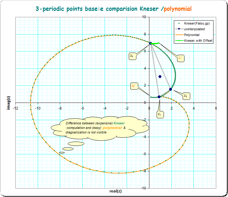 Kneser-iteration on n-periodic-points (base say \sqrt(2)) - Gottfried - 11/03/2020 From my considerations on n-periodic points I came to the question, what would the Kneser-method produce for the orbit over such periodic points, with fractional steps of some small order. I think, the Kneser-method for base \( \small b=\sqrt 2 \) gives pretty smooth orbit/curves for iteration with fractional heights, so I used that base. I can find n-periodic points of any order, at least (arbitrarily near) approximates (using my method discussed in the previous thread). Assume for instance the set of 6-periodic points (call it for instance "6-cycle") having the following approximate values: Code: p1=6.574747674571700333009302782482639405458 + 0.9684029672628275112988471898707035489652*Isuch that \( \small{p_{k+1}=b^{p_k}} \) then, in a plot generated with Excel, we see the six points, and connected by some cubic-spline-interpolation, which is of course only by accident near to the closed curve generated by the fractional iterations using the Kneser- (or any other interpolation-) method. See this picture first. I "normalized" the y-(imaginary-) axis by \( \small \Im{(z)} / \tau \) where \( \small \tau= \pi / \ln b \) *(for better comparability when this picture are made with another base)* : Note: the "key" for the cycles, mentioned in the legend of the plot, gives the periodic points in the inverse order (p1,p6,p5,p4,p3,p2) because the software uses logarithmizing instead of exponentiation) The Kneser-iterations produce as well a smooth curve do far, but much different from the cubic spline; the light-blue segment even makes a big journey out-of-bounds of the plot here. The next segments of the orbit begin to evolve to "overcycle": the pink segment continues the light blue segment and even generates some spiral around the origin. The gold and the brown segments even don't continue the attaching segments smoothely. Here is a bigger view: it may give a bit better imagination, but is still far from exposing the full chaos: Problem: the source in Fatou.gp is difficult to edit. I'd like to be able to compute in higher precision (while not sending Pari/GP in the nirvana of neverending loops). Also it seems as if the orbits of -say- tet(z,1..2) is different or sometimes different from b^tet(z,0..1). Questions: - can someone check this curves in general by recomputing data with the Kneser-method? - can someone check whether the Kneser-calculation can be made consistent at the switching points, where the segments don't follow smoothely? - the chaotic ranges of the orbits are surely caused by the branch-cuts of the logarithm or by some other well known property alike. On the other hand, we've *infinitely many* n-periodic points, somehow randomly shuttered in the shown segment. For the Schröder-function this should be catastrophic: these are points, which cannot be iterated towards the fixpoints. What does this mean for the "moving towards the fixpoint"-part in the mechanism? RE: Kneser-iteration on n-periodic-points (base say \sqrt(2)) - JmsNxn - 04/29/2021 Hey, Gottfried could you explain more what you mean? Or, what you're intending to compute mathematically? This seems interesting, and I'm rather curious. I get that you're using \( n \) cycles, \( \{z_i\}_{i=0}^{n-1}\,\,\text{s.t}\,\,\exp(z_i) = z_{i+1}\,\,\text{where}\,\,z_n = z_0\\ \) I get that you're describing this using the inverse Schroder function, \( z_i = \Psi(L^i \xi)\,\,\text{for}\,\,\xi \in \mathbb{C}\\ \) And I assume you're trying to construct Kneser's solution; which is usually done about a fixed point, but somehow you mean to do it about a cycle? I'm genuinely curious as to how one would do that. Are we essentially just performing Kneser's method on, \( \exp^{\circ n}(z)\,\,\text{about}\,\,z = z_i\\ \) Whereupon, we know this solution will still be Kneser (as far as I understand Kneser this will happen; correct me if I'm wrong, but can't one show this by uniqueness?). I'm just curious if you could link me to threads, or explain what you mean to do here. I apologize if I'm being obtuse. I'm a horrible computer programmer. As much as I've lurked Sheldon's threads about fatou.gp; I wish it was just written in math, lol. Do you mind if you explained the mathematics of what you're trying to do? Sincerely, James RE: Kneser-iteration on n-periodic-points (base say \sqrt(2)) - Gottfried - 04/29/2021 (04/29/2021, 03:02 AM)JmsNxn Wrote: (...)Hi James, I used the Kneser-solution implemented in Sheldon's "fatou.gp" program, starting at one of the 6 periodic points, say \(z_0\) , and calculating fractional iterates from that point with iteration-height \(h=0..1\) towards \(z_1\) then \(h=1..2\) towards \(z_2\) and so on. (If I've it correct at the moment, I had crosschecked the results with the simple "polynomial method", which uses \(h\)-fractional powers simply of the truncated Carlemanmatrix for \(b^x\) - which gives often good approximations for the Sheldon's Kneser-solution) I did not see "Periodic points" discussed in our forum so far, and for the forward iteration \(z_{k+1}=b^{z_k}\) it is for most bases not obvious to find periodic points at all, because of the divergent character of the iteration, say with \(b=e=\exp(1)\) for which it is known that there are no attracting fixpoints (1-periodic points) and that n-periodic points of any order are repelling. But if you use the backwards-iteration iteratively, applying the \(\log()\), then that points (1-periodic or n-periodic) are attracting. With iterative application of the \(log()\) for your fixpoint-iteration you only can find the primary fixpoint, and using the \(log()\) at branches you find the secondary fixpoints - which is of course known here in the forum from the very beginning. I extended that iteration by using the branches of the logarithm varying (but cyclic) in the sequence of iterations, so with a "key" of \(K=[0,0,1]\) I do fixpoint iteration two times with \(log()\) at the zero-bran