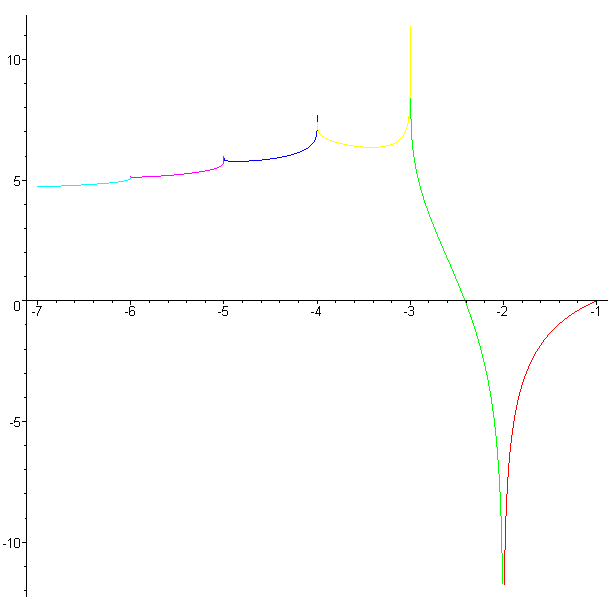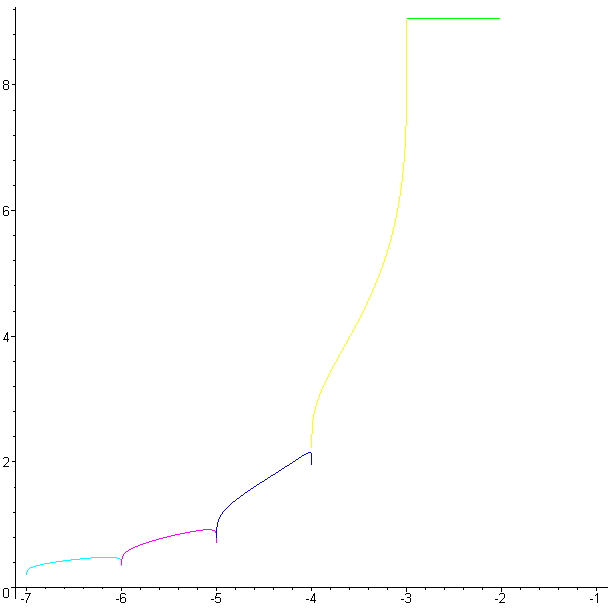 superexponential below -2 - bo198214 - 05/10/2008 I just made some pictures of real and imaginary part of \( \text{slog}_{sqrt{2}} \) below -2. The parts below -2 are just computed by taking logs of the part in -2..-1 which is computed by iterational regular iteration. But this coincides with directly computing the super exponential below -2 via the iterational regular iteration. Here the real part: Here the imaginary part: Of course this is only one branch, of the many possible while whirling/analytically continuing around all the singularities at the negative integers. As we have the symmetry \( \text{sexp}(\overline{z})=\overline{\text{sexp}(z)} \) except on the cut line, which is the real axis below -2, if we approach say -2.5 from below we get the negative imaginary value. RE: superexponential below -2 - andydude - 05/13/2008 Nice plots! A while back, I wondered whether or not those discontinuities (in the graphs) were necessary, but then upon thinking about it for awhile, it seems that there is no way to remove them with analytic continuation, maybe I'm wrong. Also, another nice plot is the Re/Im parametric plot of this same data. I used to compare that to the parametric plot of Re/Im of \( x^x \) as x goes from zero to negative infinity, but I never found anything... Andrew Robbins RE: superexponential below -2 - Ivars - 05/13/2008 For some reason, these discontinuities remind me of bifurcation points of Ljapunov exponent before going to chaos as it depends on parameter r in in an iterated logistic map leading to chaos. Just visually. I found it in a book of Schuster, Just ' Deterministic Chaos" ,Figure 23, p.35. I have no idea why there should be any relation, it is just intuitive impression from nice graphs which Henryk mysteriosly obtained. Ivars RE: superexponential below -2 - andydude - 05/14/2008 Ivars Wrote:I have no idea why there should be any relation, it is just intuitive impression from nice graphs which Henryk mysteriosly obtained. It isn't really mysterious. Do you know the graph of a tetrational function, like the ones on my website and on Wikipedia? Those are plots of \( f(x) = {}^{x}b \) for \( x>-1 \) (and b=e), but these are plots of \( f(x) = {}^{x}b \) for \( x<-1 \) (and \( b=\sqrt{2} \)). The difference is that these pictures are complex plots, which means one is the real-part and one is the imaginary-part, which is why he posted 2 plots instead of 1. Andrew Robbins RE: superexponential below -2 - Ivars - 05/15/2008 Hi Andy Thank You for clear answers. They really help. The reason I brought in chaos is the idea that by extending tetration and higher operations to real numbers of application times, also by extending operation ranks to numbers beyond rational we must hit somewhere values of these application times and ranks that leads to chaos, similar to dynamic systems. Would that be impossible? Ivars RE: superexponential below -2 - bo198214 - 05/15/2008 Ivars Wrote:we must hit somewhere values of these application times and ranks that leads to chaos, similar to dynamic systems. Of course chaos is everywhere. You probably already saw the pictures in this thread. RE: superexponential below -2 - GFR - 05/26/2008 Hi everybody ! Concerning: andydude Wrote:... , I wondered whether or not those discontinuities (in the graphs) were necessary, but ... it seems that there is no way to remove them with analytic continuation, maybe I'm wrong. I tried to figure, via Mathematica, the Henryk's plots and the results are shown in the "Sqrtwobase" attachment. As far as the x^x plot, for x < 0, I propose the second attachment, also obtained by Mathematica ("Totalxtox"). The first file suggests a conjecture. The second file is selfexplanatory (I hope). I am happy to discuss with you again. Gianfranco RE: superexponential below -2 - Ivars - 05/26/2008 Hi GFR Nice to have You back. Would that mean a possibility of general extension of x^x to negative x even with finite iterations ? Then there could be also a possibility to define any a^x with a<0 as complex number. Some Web complex number calculators do it anyway. Ivars RE: superexponential below -2 - GFR - 05/26/2008 Ivars Wrote:...That is what we were looking for. Unfortunately, we found an infinbite set of complex infinities. Mmmm! By the way, also my provisional conclusion is only a conjecture, needing a precise demonstration, ... if possible. Ivars Wrote:...Yes, this is possible and ... standard. Please see the attachment (Negbaseexp), showing an exponential at base b = -2, with: - absolute values; - real part; - imaginary part; - real and imaginary parts, "enveloped" into the + and - Abs values. I am happy to be back discussing with you. GFR RE: superexponential below -2 - Kouznetsov - 05/27/2008 Colleagues, I see you widely use Mathematica. I have few suggestions. 1. type ";" after the Plot[...] operator; this saves one cm at the screen of the reafer. 2. Use colors (as bo198214 does), add argument ,PlotStyle->{RGBColor[0,0,0],RGBColor[1,0,0],...} ; then it is easier to see, where is the real part, where is the imaginary one. 3. Use ImplicitPlot function; then you can plot functions (for example, its real and imaginary parts) the complex plane, and by-pass the singularities which are usually at the real axix. Also, the cuts and branchpoints become seen. 4. Use copylefted C++ function conto, it plots contours better than Mathematica, but you need some programming; see the code and the example at http://en.citizendium.org/wiki/AnalyticTetrationBaseSqrt2u00/code |
