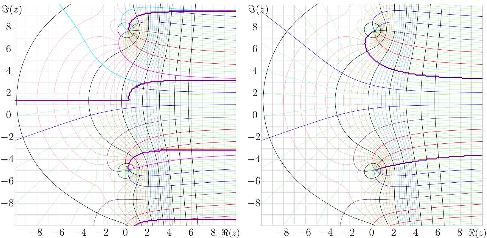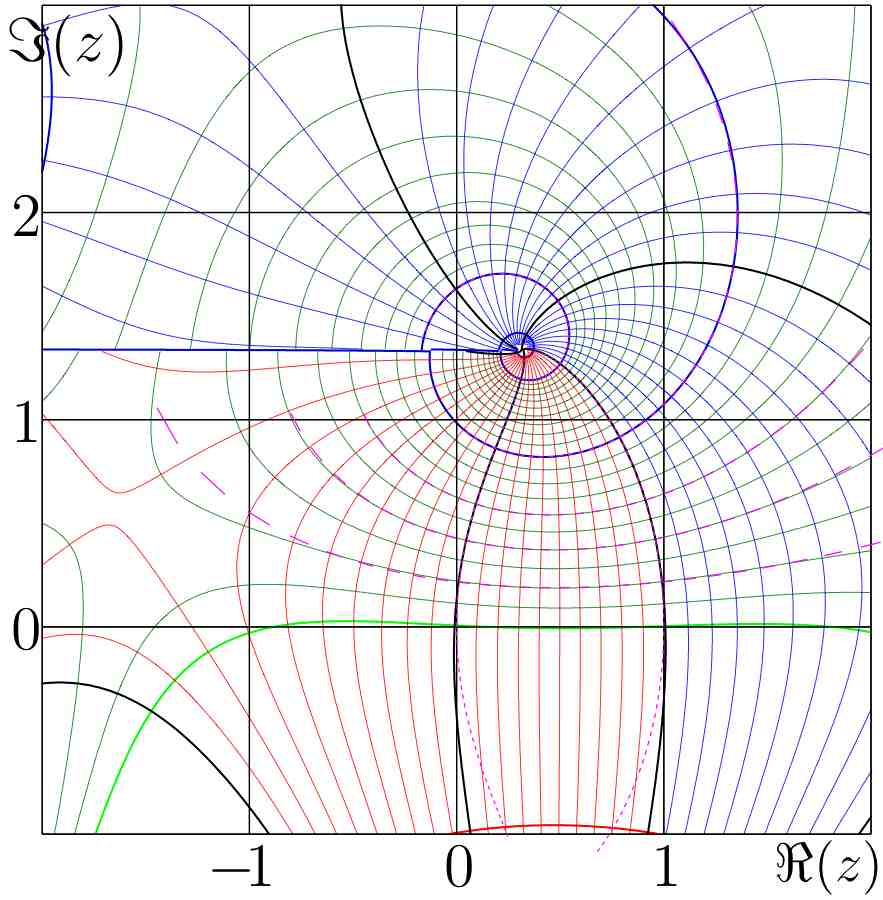 real slog developed at a fixed point - bo198214 - 11/29/2008 Following an idea of Dmitrii we make the ansatz: \( \text{slog}(z)=\frac{1}{\el}\left(\log(z-\el) + r(z-\el)\right) \) where \( \el \) is the fixed point of \( \log \) in the upper half plane and \( r \) is a powerseries developed at \( \el \). \( \text{slog} \) must satisfy: \( \text{slog}(\exp(z))=\text{slog}(z)+1 \) and hence: \( \log(e^z-\el)+r(e^z-\el)=\log(z-\el)+r(z-\el)+\el \) \( \log\left(\frac{e^z-\el}{z-\el}\right)=r(z-\el)-r(e^z-\el)+\el \) The left side has no singularity at \( \el \) hence we do the transformation \( z\mapsto z+\el \): \( \log\left(\frac{\el(e^z-1)}{z}\right)=r(z)-r(\el(e^z-1))+\el \) (*) \( \log\left(\frac{e^z-1}{z}\right)=r(z)-r(\el(e^z-1)) \) The left side can be developed as: \( \log\left(\frac{e^z-1}{z}\right)= \frac{1}{2}z+\frac{1}{24}z^2-\frac{1}{2880}z^4+\frac{1}{181440}z^6 -\frac{1}{9676800}z^8+\frac{1}{479001600}z^{10}+\dots \) Let \( \lambda_k \) be the coefficients of this series. And let \( \eta_k \) be the coefficients of the series \( \el(e^z-1)=\el z + \frac{\el}{2} z^2 + \frac{\el}{6} z^3 + \dots \). Then on the right hand side of (*) we have: \( (r-r\circ \eta)_n = r_n - \sum_{j=0}^n r_j (\eta^{\cdot j})_n \) by the composition rule for powerseries (Carleman matrix multiplication) where \( \eta^{\cdot j} \) means the \( j \)-th power (not iteration) of \( \eta \). This yields a recursive formula for \( r_n \): \( r_n(1-(\eta^{\cdot n})_n)=\lambda_n + \sum_{j=0}^{n-1} r_j (\eta^{\cdot j})_n \) Because \( \eta^{\cdot 0}=1 \) we can start the right hand sum at 1 instead of 0 if \( n>0 \), so: \( r_n = \frac{\lambda_n + \sum_{j=1}^{n-1} r_j (\eta^{\cdot j})_n}{1-(\eta^{\cdot n})_n} \) for \( n>0 \). Now we know that \( \eta^{\cdot j}(z)=\el^j (e^z-1)^j=\el^j\sum_{k=0}^j \left(j\\k\right)e^{kz}(-1)^{j-k} \) \( \left(\eta^{\cdot j}\right)_n=\el^j \sum_{k=0}^j \left(j\\k\right)\frac{k^n}{n!}(-1)^{j-k}=\el^j \sum_{k=1}^j \left(j\\k\right)\frac{k^n}{n!}(-1)^{j-k} \) So for example: \( r_1=\frac{\lambda_1}{1-\eta_1}=\frac{1/2}{1-\el} \) \( r_2=\frac{\lambda_2 + \eta_2}{1-(\eta^{\cdot 2})_2}=\frac{\frac{1}{24}+\frac{1}{2-2\el}\frac{\el}{2}}{1-\el^2(-1+2^2/2)}=\frac{\el}{{4 {\el}^{3} } - {4 {\el}^{2} } - {4 \el} + 4} + \frac{1}{24 - {24 {\el}^{2} }} \) \( r_3=\frac{\el}{{-12 {\el}^{6} } + {12 {\el}^{5} } + {12 {\el}^{4} } - {12 {\el}^{2} } - {12 \el} + 12} + \frac{{\el}^{2} }{{24 {\el}^{5} } - {24 {\el}^{3} } - {24 {\el}^{2} } + 24}+\frac{{\el}^{3} }{{-6 {\el}^{6} } + {6 {\el}^{5} } + {6 {\el}^{4} } - {6 {\el}^{2} } - {6 \el} + 6} \) RE: real slog developed at a fixed point - Kouznetsov - 12/03/2008 bo198214 Wrote:...Let \( f_1=\log(e^z-\el)-\log(z-\el) \) \( f_2=\log\left(\frac{e^z-\el}{z-\el}\right) \) Perhaps, it is supposed that \( f_1=f_2 \). I plot both functions below. Levels \( \Re(f)=-2,-1,0,1,2,3,4 \) are shown with thick black curves. Levels \( \Re(f)=-1.8,-1.6,-1.4,-1.2,-0.8,-0.6,-0.4,-0.2 \) are shown with thin red curves. Levels \( \Re(f)= 0.2, 0.4, 0.6, 0.8, 1.2, 1.4, 1.6, 1.8 \) are shown with thin red curves. Levels \( \Im(f)=-2,-1 \) are shown with thick red curves. Levels \( \Im(f)=1,2 \) are shown with thick blue curves. Levels \( \Im(f)=\pm \pi,\pm 3\pi \) are shown with thick pink curves. Levels \( \Im(f)=-4 \) is shown with cyan curve. Levels \( \Im(f)=-1.8,-1.6,-1.4,-1.2,-0.8,-0.6,-0.4,-0.2 \) are shown with thin red curves. Levels \( \Im(f)= 0.2, 0.4, 0.6, 0.8, 1.2, 1.4, 1.6, 1.8 \) are shown with thin red curves. RE: real slog developed at a fixed point - Kouznetsov - 12/07/2008 Dear Henryk. I already have expessed some doubts, but now I see, my misunderstanding begins even earlier. I do not understand even the title: how the slog can be real at the fixed point? On the other hand, I suggest the asymptotic development of sexp at large values of the imaginary part of the argument. Let \( \varepsilon=\varepsilon(z)=\exp(\el z +R) \), where \( \el \approx 0.3+1.3 i \) is fixed point of logarithm and \( R \) is some complex constant. Then, equation \( f(z+1)=exp(f(z)) \) allows the asumptotic expansion, using \( \varepsilon \) as small parameter: \( \mathrm{sexp}(z)=\sum_{n=0}^N a_n \varepsilon^n +\mathcal{O}(\varepsilon^{N+1}) \). The first coefficients of this expansion are: \( a_0=\el \), \( a_1=1 \), \( a_2=\frac{1/2}{\el-1}\approx -0.151314 - 0.2967488 \mathrm{i}~,~ \) \( a_3=\frac{a_2+1/6}{\el^2-1}\approx -0.36976 + 0.98730 \mathrm{i} \) \( a_4= a4=(a2/2.+a_2^2/2.+a_3+1./24.)/(\ell^3-1.) \approx 0.025811 -0.017387 i \). I evaluate the parameter \( R\approx 1.077961437527-0.946540963949 i \), fitting tetration sexp at large values of the imaginary part, with the approximation at \( N=4 \). I plot the deviation of tetration from the asymptoric approximation with \( N=0,1,2,3 \) in the figiures below. The four plots correspond to the four asumptotic approximations. The deviations \( f=\mathrm{slog}(z)-L \), \( f=\mathrm{slog}(z)-\Big(L+\varepsilon(z)\Big) \), \( f=\mathrm{slog}(z)-\Big(L+\varepsilon+a_2 \varepsilon^2 \Big) \), \( f=\mathrm{slog}(z)-\Big(L+\varepsilon+a_2 \varepsilon^2 + a_3 \varepsilon^3\Big) \) are shown in the complex plane with lines of constant phase and constant modulus. Levels \( \arg(f)=-2,-1 \) are shown with thick red lines. Level \( \arg(f)=0 \) is shown with thick black lines. Levels \( \arg(f)=1,2 \) are shown with thick blue lines. Levels \( \arg(f)=\pm \pi \) are shown with scratched lines. (these lines reveal the step of sampling used by the plotter). Levels \( |f|=\exp(-0. ,\exp(-0.6),\exp(-0.4),\exp(-0.2) \) are shown with thin red lines.Levels \( |f|=\exp(0.2),\exp(0.4),\exp(0.6),\exp(-0. \) are shown with thin blue lines.Levels \( |f|=\exp(3), \exp(2), \exp(1),\exp(0), \exp(-\!1), \exp(-\!2), \exp(-\!3), \exp(-\!4), \exp(-\!5), \exp(-\!5), \exp(-\!7), \exp(-\! \) are shown with thin thick black lines.Level \( |f|=\exp(-10) \) is shown with thick red line. Levels \( |f|= \exp(-12),\exp(-14), \exp(-16),\exp(-1 \) are shown with thick 