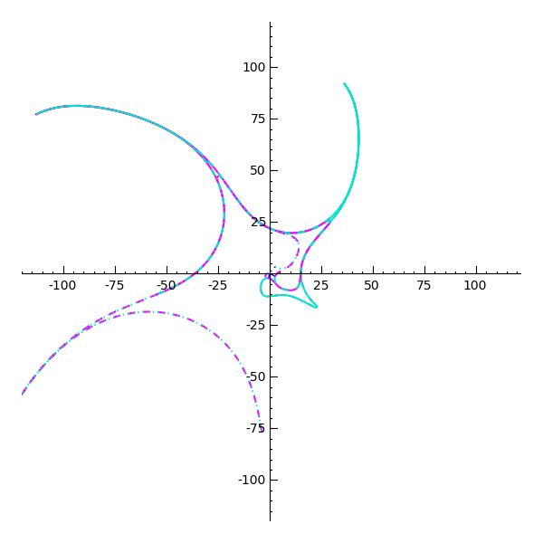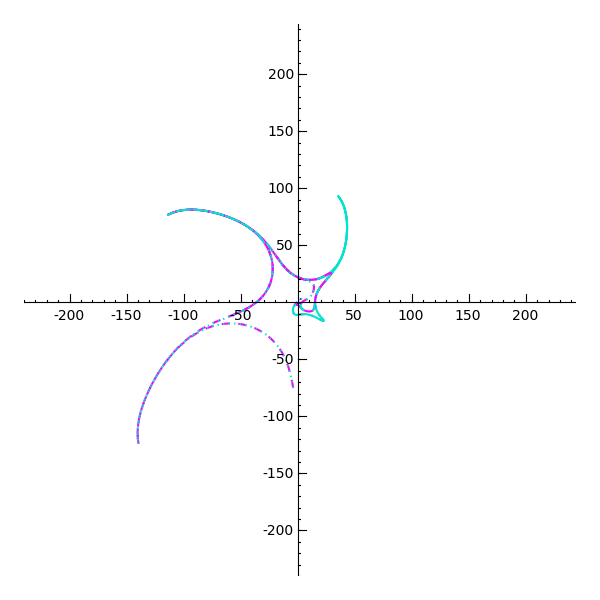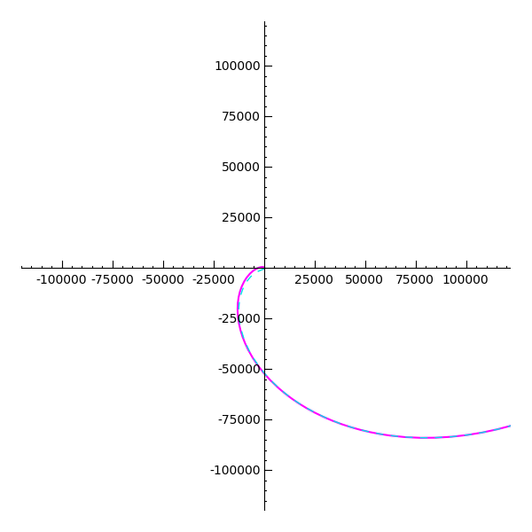Attempting to compute the kslog numerically (i.e., Kneser's construction) - jaydfox - 09/24/2009 Well, I was fairly certain the Kneser's solution would be equivalent to the intuitive slog, as there is a uniqueness condition which I've seen explained a couple different ways, but it boils down to the same thing. So I decided to put this to the test, at least within the limits of computational accuracy. Due to the nature of the singularities in the regular slog at 0 and 1, the kslog becomes rather difficult to compute accurately. However, after tweaking and experimenting and tweaking some more, I've found a setup that yields decent accuracy, to at least 20-25 bits over most of the unit interval. In order to prevent my results from being biased by my preference for the intuitive slog, I initially parameterized the unit interval with a second-order polynomial: (-2*sqrt(6) + 6)*z + R(6*sqrt(6)-15)*z^2 + R(-4*sqrt(6)+10)*z^3 This was done to ensure a continuous second derivative on the boundary of the region that I was trying to map to the unit disk (for the riemann mapping phase). The singularity probably makes this step unnecessary, but I felt it better to be safe than sorry. I did not try to make the initial parameterization any more "accurate" than this, as this might introduce bias into the results (e.g., if I merely used the isexp as the parameterization). I calculated 2835 equally spaced points along the parameterized boundary, which is 27*105. This allowed me to solve systems with 105, 315, 945, and 2835 points, and monitor the convergence. The 105 allows me to break the point set into groups of 6, 10, or 14 intervals, in order to compute the integrals more accurately (more on that later). Incidentally, convergence is slow, yielding just under 3 bits of precision for each tripling of system size. This more or less corresponds to 2 bits per doubling, compared with about 6 bits per system doubling for my accelerated islog solution. On the other hand, the kslog is extremely numerically stable. A 1200x1200 system for the accelerated islog requires about 1600 bits of precision just to "break even", while the kslog requires about 11-15 bits for the same size system. Anyway, before I start getting into the gritty details (some of which I'll probably not get to until tomorrow), I wanted to post my comparison of the kslog and the islog. The SAGE plotting library refuses to label the axes on this graph, so I drew light grey lines at intervals of 10^-7, with a darker line at 10^-6. As you can see, the accuracy over most of the unit interval is about 10^-7, about 23 bits' worth, which is about how accurate the computed kslog is (based on convergence analysis). So roughly to within the accuracy of the calculations, the kslog and the islog are probably the same. The error is at most an order of magnitude larger than I expected, based on convergence analysis, so I'm not ready to declare this issue settled just yet. I'm still trying to tune my matrix system, which is temperamental due to the singularities. This graph is the difference between the 2835 kslog points I computed and the islog at the same points, setting kslog(0.5)=islog(0.5). Note that due to the way the kslog is calculated, I cannot find a value for kslog(0) or kslog(1), so there's not an obvious way to compare the kslog and islog directly, other than to try to reduce the RMS error for all 2835 points. The derivatives can be compared directly, and I'll be trying that next. RE: Attempting to compute the kslog numerically (i.e., Kneser's construction) - jaydfox - 09/24/2009 Okay, here is the convergence analysis. The blue lines represent (from top to bottom) the error (in bits) in the 105, 315, 945, and 2835 point systems, relative to the 2835 point 10-interval interpolated system. A note here: The solutions are found by solving an integral using a system of equations, which basically means solving a matrix equation. Just as extra accuracy for an integral can be achieved by using weights to simulate polynomial interpolation, I've achieved extra accuracy in the matrix system by weighting each point appropriately. Note that this must be tuned by hand. For example, Fejer quadrature would seem an obvious choice here, but the singularities at each end of the interval cause Fejer quadrature to give horrible results, which I did not expect. Anyway, to demonstrate the increased accuracy empirically, note the red lines. These correspond to the 105, 315, and 945 point systems, using 10-interval interpolation polynomials (11-points, with common endpoints). Note that in all three cases, they are about 2-3 bits more accurate than the "rectangle" quadratures. Indeed, they are almost as accurate as using a system three times as large! Convergence is fairly linear, about 2.5 to 3 bits per system doubling. And the convergence near the singularities is even better, which is a good thing, as the accuracy is quite bad near the singularities (0 and 1, the endpoints of the interval). My next test will be to use 14 point intervals. For a large enough system, this should improve accuracy, but I anticipate the 105-point system might actually get worse. RE: Attempting to compute the kslog numerically (i.e., Kneser's construction) - jaydfox - 09/24/2009 (09/24/2009, 12:17 AM)jaydfox Wrote: Anyway, to demonstrate the increased accuracy empirically, note the red lines. These correspond to the 105, 315, and 945 point systems, using 10-interval interpolation polynomials (11-points, with common endpoints).Also, if you're wondering how I divide a 105-interval region into 10-interval sub-regions, note that the end regions are 7.5 intervals wide. So I would have an interpolating polynomial from 0 to 15/210, using the points 1/210, 3/210, 5/210, 7/210, 9/210, 11/210, 13/210, and 15/210. And thus on the other end of the interval as well (reflected, more or less). As I start posting details and code, hopefully this will begin to make more sense. RE: Attempting to compute the ks