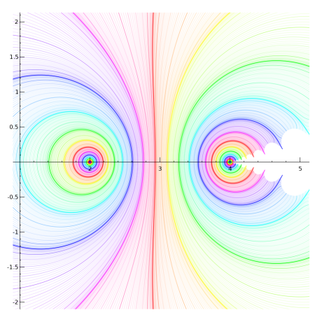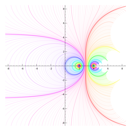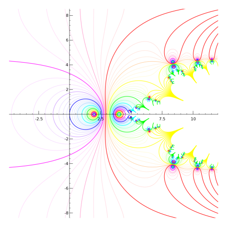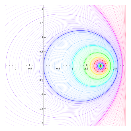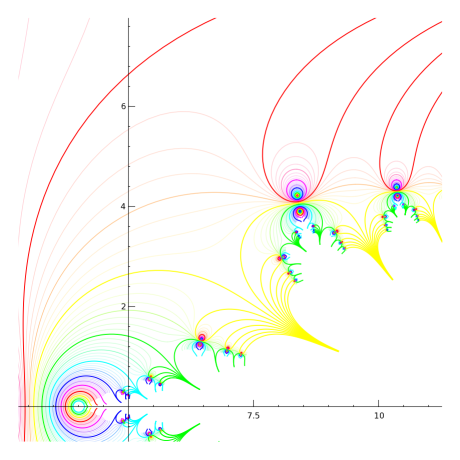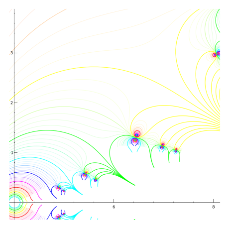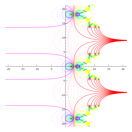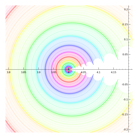 Regular slog for base sqrt(2) - Using z=2 - jaydfox - 11/15/2007 I'm still working on graphs, but it's not easy to strike a balance between using enough grid points to make a smooth graph and using few enough to keep memory usage within 1.5 GB and compute time to a fraction of an hour. By the way, these are half-sized versions of the ones I originally made. I was going to attach them (without embedding them) for those who wanted to download them, but they are over 1 MB each, and I can't attach them at that size. I suppose I can email them if anyone wants to see the larger versions, but the small versions preserve most of the interesting details. Okay, to establish (hopefully) clearly how I'm calculating the regular slog, here's a view at z=2, zoomed in pretty far. Note that each curve is almost a circle. Indeed, the further we drill down, the more they will look like circles. An explanation is due here. Each circle is a contour of constant real part. No, they are not evenly spaced, nor even exponentially spaced. I will explain the spacing later. Essentially, I iteratively exponentiated zero, for reference 57 times. I picked a number that puts a blue ring going through the origin, based on my palette, if you're wondering why 57. There is still a fair amount of inaccuracy here, but not enough to show up on the graph. Once I had the 57th iterate of 0, I found the 58th (i.e., the 57th iterate of 1), and then subtracted each from 2. The distances from 2 are decreasing exponentially, so I take a natural logarithm of each, calling them l0 and l1 respectively (for log of "zero" and log of "one"). I then subtract, giving -0.36653913, which is very near the predicted value of ln(ln(2)). I'll call this value dl (for difference of logarithmcs). I then create a grid of values (not evenly spaced), with real parts on the interval \( (l0,l0+dl) \), and imaginary part on the interval \( \left(0, \text{abs}(\pi / dl)) \). When I exponentiate (base e) the values in this grid, I get half a hollow disk, which I then subtract (point by point) from 2. Its inner radius passes through the 57th exponentiation of 1, the outer radius passes through the 57th exponentiation of 0. It's only a half of a hollow disk. I don't actually calculate the points above the real line; rather, I simply graph the lower half plane and mirror it to get the other half. Then, I can simply take the logarithm of this grid, point by point, to get each successive layer moving out from the fixed point. Here, I've zoomed out by a factor of 10. Don't be fooled by the small shift in the position of the colors: we've gone more than a full cycle through the palette. Note the scale on the axes. The red circle that was clipped and only visible in the corners is now the red circle that fits comfortably between the text labels closest to the origin. RE: Regular slog for base sqrt(2) - Using z=2 - jaydfox - 11/15/2007 Zooming out another factor of 10, the non-circularity of the contours becomes obvious. Finally, we're zoomed out enough here to see the origin. Notice that we're almost to the interesting part, where our ovals are no longer connected loops. (Technically, they're not connected now, because the imaginary parts increase counter-clockwise, due to the logarithmic singularity. However, the branches are all the same, at least when we calculate the regular slog at 2.) This is where I can describe the peculiar spacing of the contours. When I take the logarithm of points near the origin, they will towards negative infinity. To get any kind of decent picture of what happens in the left half plane, I had to make my contours bunch up around the origin. And because of how I calculate each region as the logarithm of a region closer to the singularity, I had to effect this strategy from the outset. Therefore, I created a cyclic mapping of the real parts, \( c\left(\Re(z)\right) = \Re(z) - \frac{\sin\left(2\pi \Re(z)\right)}{2\pi} \) This gives me a slope of 0 at the integers, so that I can get values very close to 0 when I get back to the origin. In the next posts, you'll see the effect I was going for. RE: Regular slog for base sqrt(2) - Using z=2 - jaydfox - 11/15/2007 Now, here's an image zoomed out a factor of 4, and centered at the origin. This allows us to see an overview of the slog. Note that there's a lot of detail missing to the right. So far, only the principal branch has been used for the logarithms I've been calculating. I have 64 contours for each unit interval, with about 200 points in the imaginary direction, calculated for about 80 regions. Adding even one branch begins to push the limits of my laptop. When I start showing branches, I will be reducing the number of contours per interval accordingly. RE: Regular slog for base sqrt(2) - Using z=2 - jaydfox - 11/15/2007 Before I start showing branches, I wanted to show you zoom-ins of the singularity at z=4. I believe the term for it is essentialy singularity, as there is a line of singularities approaching it from the right, a countably infinite number of singularities that have z=4 as their limit point. Thus, we cannot remove this singularity in the traditional sense. The singularity at 2 is removable, in the sense that a Taylor series developed arbitrarily close to z=2 would have a radius of convergence limited by the singularity at z=4. I'm not sure if it's valid to develop a power series at z=2 after removing the singularity, however. Anyway, here's the first zoomin, showing both singularities, to help you appreciate the difference between them: Notice that the red line in the middle is fairly straight. Somewhere in that vicinity, the curvature of the contours at the real points switches from left-curving to right-curving. This is a point of inflection for the rslog on the real interval between z=2 and z=4. I'm not sure what if any significance this has, but it is similar in principle to the point of inflection on the critical interval for base e, and it's worth further exploration a