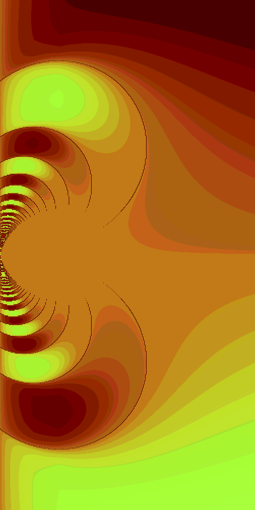 Here is the rough plot (only 129 x 64 points in the right half of the unit-square. The black regions should collapse into black lines only and their curved forms resemble roughly the bold red interpolation-lines in my other graph.