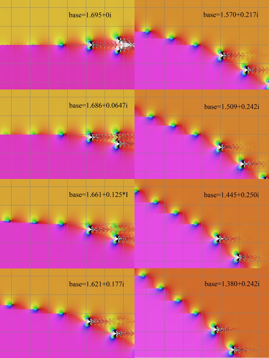 Here are some plots, as the base loops around eta. The first image is for base=eta+0.25, which is tetration at the real axis. Then each subsequent image is for the base looped around eta, pi/12th of a circle, counter clockwise. Then the 12th image is for base=1.195, and then I continued around to imag(z)<0. I stopped at B=1.621-0.1768i, which didn't converge. I included it anyway, in the image, just to show what might happens. My guess is that these merged solutions cannot be continued past the 2nd Shell Thron boundary, even though they can be continued from tetration at the real axis, to the first Shell Thron boundary in the upper half of the complex plane. But continuing around to bases less than eta, and than to bases with imag(z)<0, solutions become impossible the second time you cross the Shell Thron boundary. The grid lines for all of these plots are at 5 units, with the center of the plot at z=0, where sexp(z)=1.