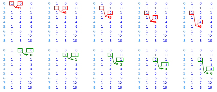 Okay, time to look at the patterns. The first picture shows how the coefficients can be calculated by a recurrence relation that's actually quite similar to the basic recurrence relation for the sequence itself: