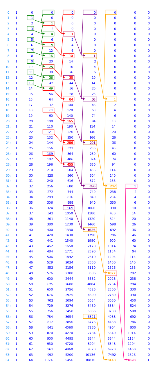 In column 4, the 8th entries are 0, 1, 36, 201, 656, 1625, etc., which fit a degree 4 polynomial: