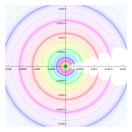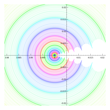 You might be tempted, looking at the second image in the previous post, to hope that the white space to the right of the singularity will close off, i.e., that the angle will decrease arbitrarily. In fact, we know that there will always be an angle there, because the bases of the "logarithms" at each singularity are different.