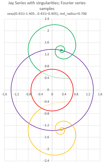 There is the limitation that your 800th term is 10^-126, so we need to keep the sample radius as small as possible. Here, the \( \theta_\R \) sample points are with slog(z) where |z|<0.706, which is the radius of the red circle. Sampling on the green dots sexp(0.431i-1.405...0.431i-0.405), we are limited to 35 complex conjugate pairs in the Fourier series, before the Fourier series becomes random noise.