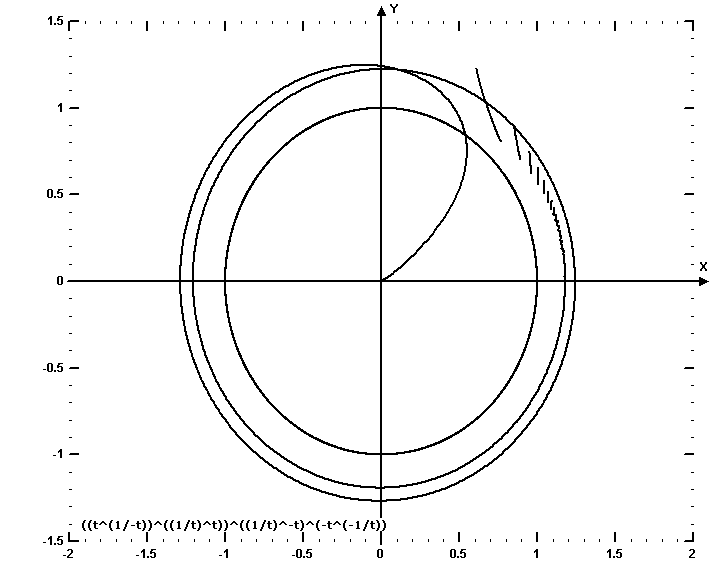 And this with 2 minus signs in the middle just makes unit circle in polar coordnates with fine structure ( if zooomed )starting from t=4,414689*pi which can be seen in integral jump.