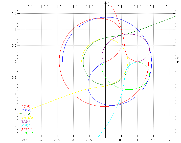 I have plotted all 8 "spirals " of the form 4 : ( +-t^+-1/t), 4: (+- 1/t)^+-(t) in polar coordinates and there are certainly interesting forms , crossing points, and regions.