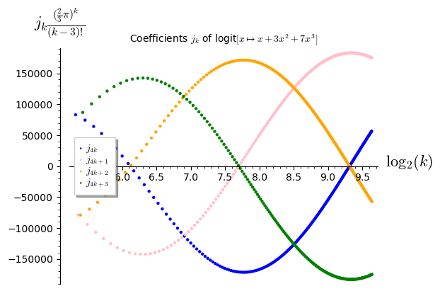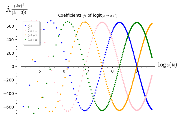 From the example before one could conclude that the coefficient growth would be \(\frac{(k-3)!}{(2\pi)^k}\). But this is totally not the case, the logit is converging! The logit j has the coefficients:
