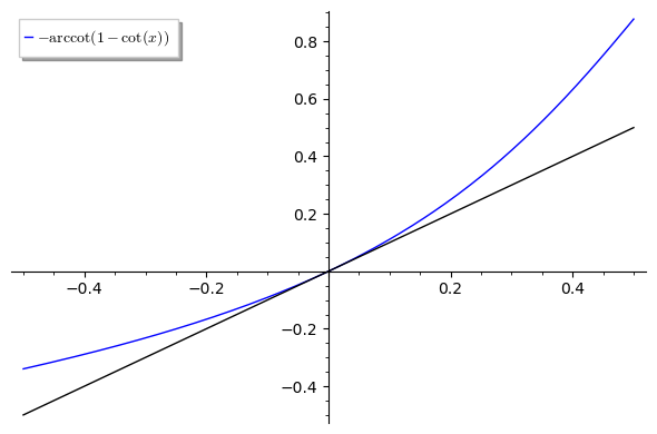 As we are only interested in a small vicinity around 0, I omit the branch compensation. So we are looking for a powerseries expansion of this function. Actually Sage has difficulties calculating the powerseries because division of 0, so I took the detour differentiating the function \(f'(x) = \frac{\cot(x)^2 + 1}{(1-\cot(x))^2 + 1}\), then calculating the formal powerseries and integrating it, so these are the coefficients of f