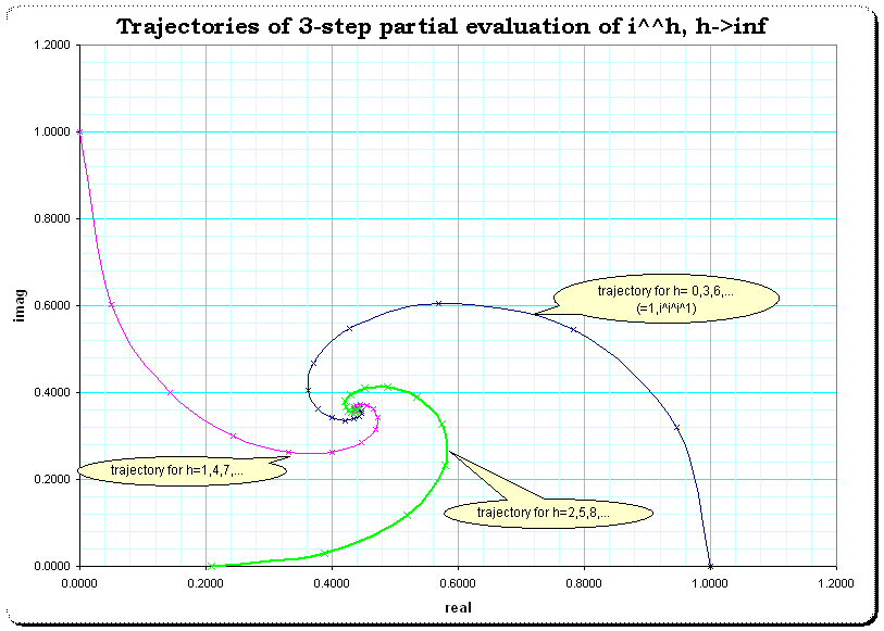 My guess is that tetraton (y = b[4]x) is one multivalued real and/or complex "function" of x, depending on the value of base b > 0. Oscillations of y = b[4]x, for constant b, should be produced, at b < 1, by a complex y, multivalued "function" of a real variable x, which appear as such in a "real" projection on the yx plane. But, we must find such a "function", the smoothness of which would appear in this real projection (continuous and infinite-time derivable, continuity class Coo). Outside the yellow zone, the oscillations vanish for x -> oo. Inside the yellow zone, they remain persistent at x = +oo (sorry for my ... non standarization!).