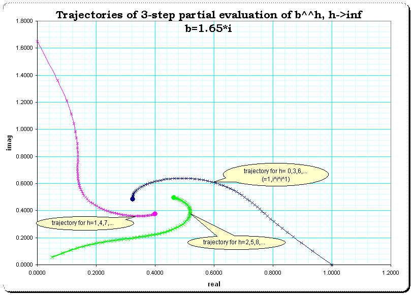 For some b the three points happen to converge to the same value, where each one follows a certain trajectory, for other b they stabilize very fast to their distinct individual values. Also for not purely imaginary b one gets different multi-furcation with various lengthes of periods.