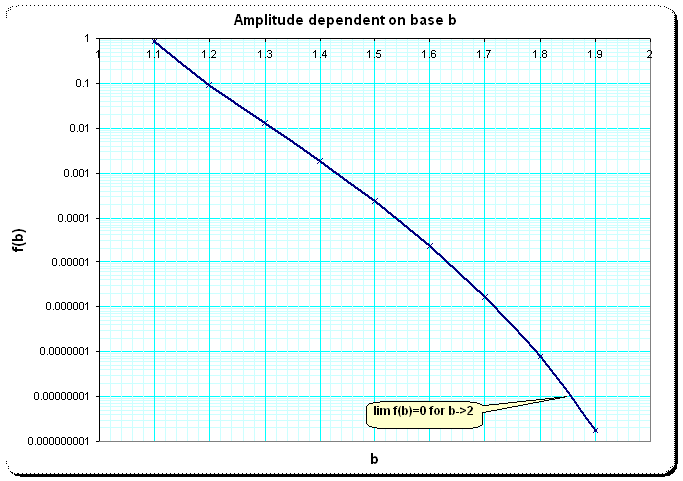 Well we can see the slight change of slope in the left of your reproduced graph for the amplitude. I suspected thus, that your proposed formula for the amplitude is too simple; simply look at the smaller bases. To improve the visual impression I took for instance base b=1.05 and got an amplitude of 4.388... Smaller bases give values again greater in absolute value, however changing in sign (possibly reflecting the "phase"-graph in my older article, I'll see to extract it and put it here for the current discussion).