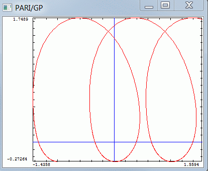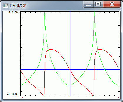 Here we have a complex plot of \( \theta(z) \) at \( \Im(z)=0.375i \), \( -1<\Re(z)<1 \), where you can clearly see the influence of the singularity is at z=-0.51389+0.38009i. Red is real, and green is imaginary.