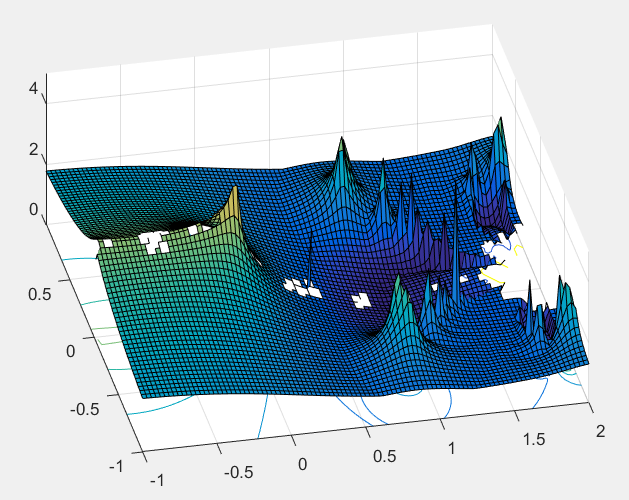 You can see what I mean here; where it converges much better in some areas (the singularity is more obviously a singularity; the dip to zero is more prominent; and the imaginary arguments seem more dramatic), but then some singularities in the code appear (these spikes pop out of the wood work, which are definitely artifacts). Which is no doubt, because my iteration requires larger samples \( n \) of \( \beta_\lambda(s+n) \) to produce a more accurate result. But larger values of \( n \) is producing overflow errors, because it looks like tetration... -_- A computer knows no difference between \( \log \exp^{\circ 10}(z) \) and \( \log \exp^{\circ 9}(z) \)--at least in MatLab.  Couple that with some round-off errors, and some poorly coded exponentials; and we get blow ups which follow a dynamic pattern. (A lot of the code errors look like Leau Petals, so at least that's kind of cool, lol.)