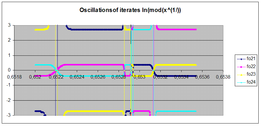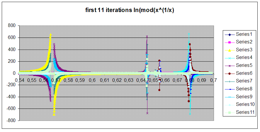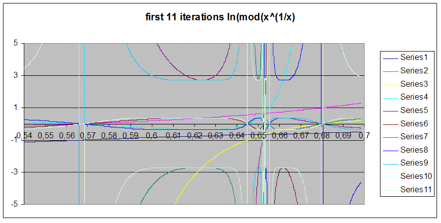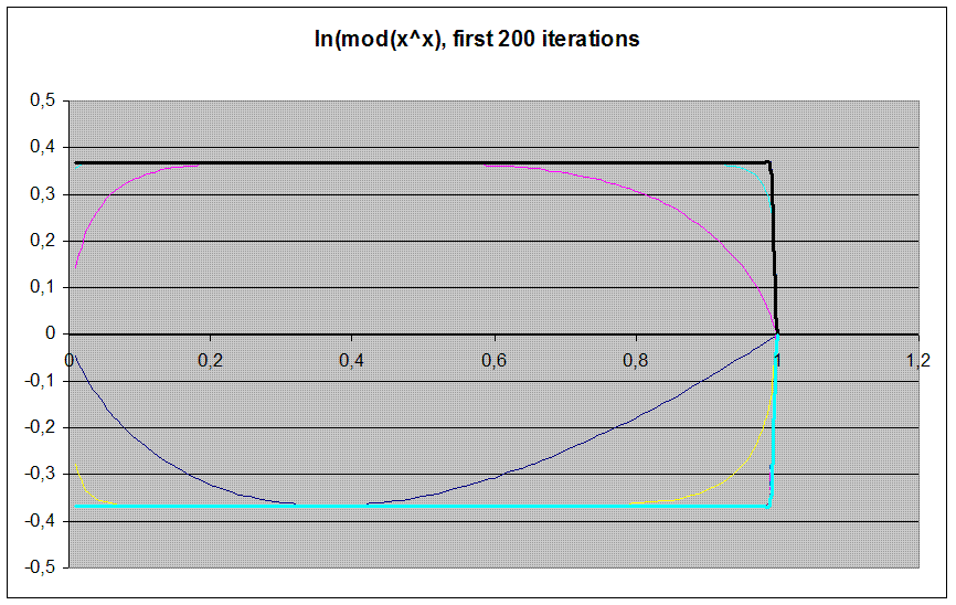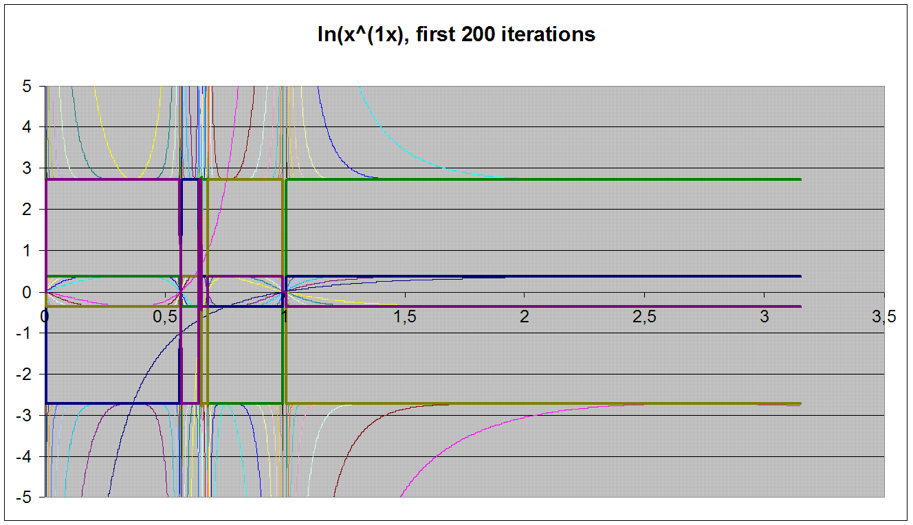 \( f(x)= \ln(x^{(1/x)}) \) is more interesting. This iteration converges to 4 values for each x, cyclicaly,and their dependance on n is shifting depending the region x is in the interval ]0:1[. The convergence values are :