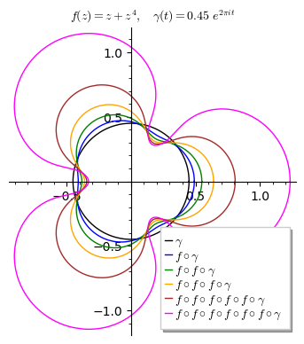 Also it cleared up things for me. For example I always thought that the parabolic case is (in a quite direct manner) the merge of hyperbolic fixed points. But this is surely not true when considering the number of petals which is 2*(n-1) while the number of perturbed fixed points is n. (Only for the case n=2 the numbers would equal.) Also depending on the perturbation the fixed points would come from different directions and have different multipliers. I made a picture of the perturbed Leau-Fatou flowers for the case n=5, \(f(x)=x+x^5 - c^5\) where I moved c around 0, \(|c|=0.4\) or \(|c|=0.2\):