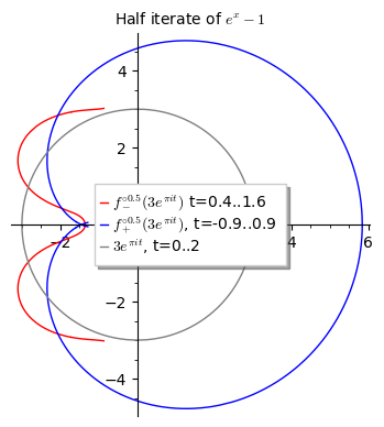 But one can really see that both differ a lot! It is not as tiny a difference as with the half iterates of \(\sqrt{2}^x\) (on the other hand we didn't look at the complex plane there).