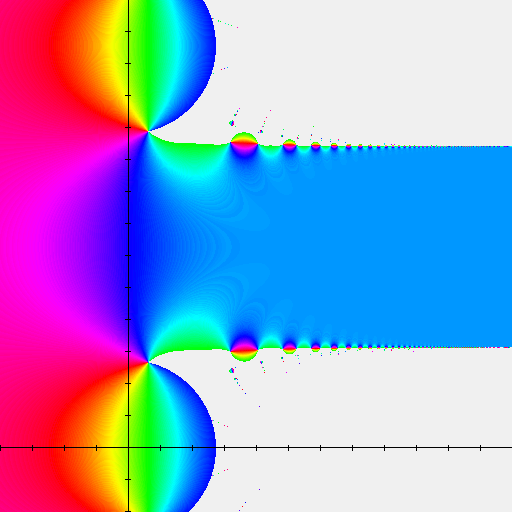 BTW, each of these new projections (the "ribs") will stretch out to a positive infinity (i.e., with real part going to positive infinity). And before we do so, notice that if we try to logarithmicize one more time, we'll have overlap with the critical region. This is due to the fractal branching of the slog. We can only wrap roughly four "unit" regions around a singularity before we overlap. The best we can do for now is to remove one iterated region from the graph as we add another. In this case, we'll take one region off the "exponential" end of the graph, to make room for a logarithmicized one. (We could go the other way, of course, to analyze the exponential branches, which I'll do in a later post.)