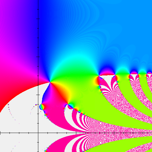 Also, please note that the green at the boundary of the critical region is NOT the same green as the branches off the ribs. My color palette cycles every three iterations, so for now we have to pay attention. By the time I do graphs with the Andrew's slog, I'll have a color system worked out. For now, I'm rather limited, since I'm using a hack in SAGE to generate these graphs. (For the curious, I'm using a matrix_plot with a 512x512 matrix, and the image size just right to get one pixel per element (6.13x6.13), and I'm using the "hsv" color map with an algorithm that jumbles the colors enough to get 1024 distinguishable colored intervals out of a 256-color palette.)