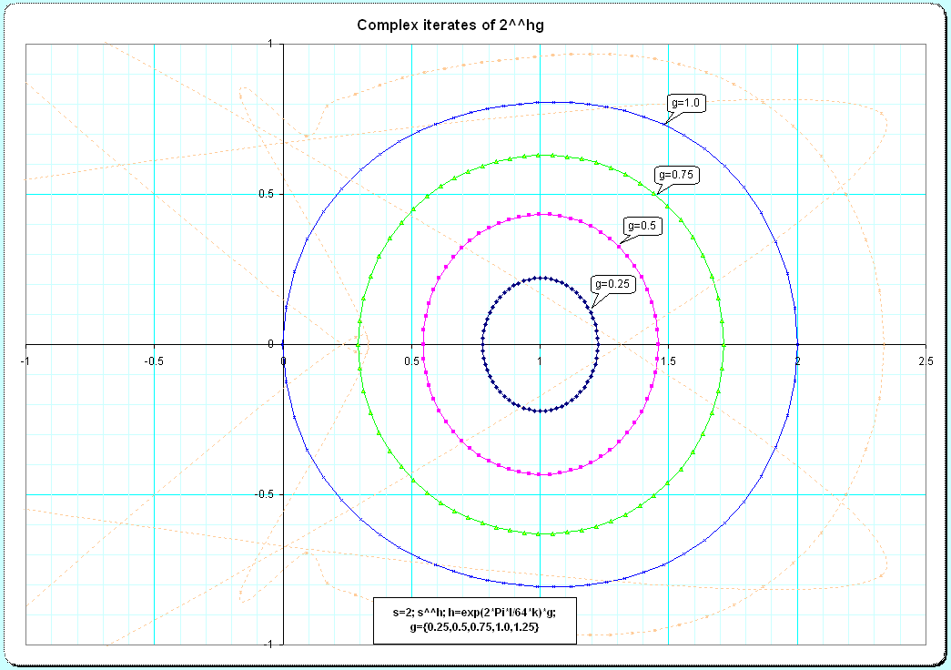 The complex circle of radius |1| was divided in 64 steps. indicated by k as the number, so each k represents 1/64 of the circumference of the complex unit-circle. But this is only using g=1. I added the other results for equivalent parameters on the complex circles of smaller radii too.