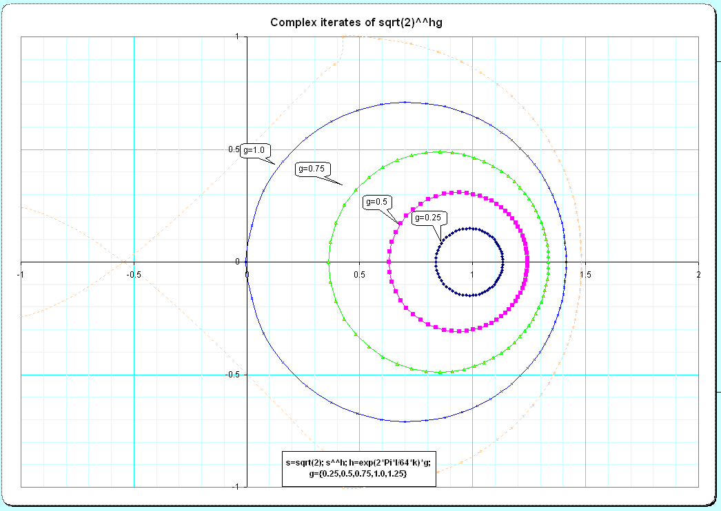 Here I add two plots, which show bases s=2 and base s=sqrt(2), when tetrated to complex heights h. The height-parameter h follows the border of the complex unit-disk, so passes the coordinates (1,0),(0,i),(-1,0),(0,-i ) and is exp(2*Pi*I*x) .