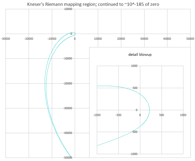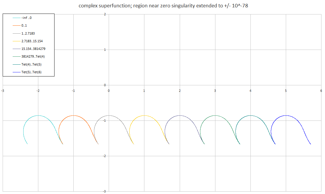 Pictures of the Chi-Star - sheldonison - 05/28/2017 Some number of years ago in 2011, I made some complex plane graphs of the inverse Schröder function super-imposed with Kneser's Chi-star function, but it turns out I never posted them online since I skipped right to the complex valued superfunction instead; http://math.eretrandre.org/tetrationforum/showthread.php?tid=700&pid=6193#pid6193 Working directly with the Schröder and Chi-star function is probably more mathematically accessible. So I thought I would put together a post with some pretty pictures of Kneser's Chi-star function. Let's start with the \( \Psi \) (or Schröder function) for exp(z) developed at the complex fixed point, L~=0.318132 + 1.33724i; where exp(L)=L, and the multiplier \( \lambda \) at the fixed point is also L since \( \exp(L+\delta)\approx L+L\cdot\delta \Rightarrow\;\lambda=L \) The defining equation for the Schröder function is \( \Psi(e^z) = \lambda\cdot \Psi(z) \). Remarkably, this function maps iterated exponentiation base e to multiplication by \( \lambda \). Of course \( \Psi(0) \) has what turns out to be a really complicated singularity. Kneser's Chi-Star \( \chi(z) \) function maps the Schröder \( \Psi \) function of the real number line to get the Chi-star function. \( \chi(z)=\Psi\circ\Re\;\; \) This is the Schröder of the real number line. It is also probably the most natural first step in generating analytic real valued Tetration. And it is a very pretty function. From the definition of the \( \Psi \) then \( \chi(e^z)=\lambda\cdot\chi(z) \) The first pretty picture I'm posting is the inverse Schröder \( \Psi^{-1}(z) \), covering the range of \( \pm 30 ... \pm 20i \), and superimposed with Kneser's Chi-star \( \chi(z) \) function. Of course, its difficult to grasp the details of this pretty picture. Lets start with the definition. Normally, one generates the Taylor series coefficients of the \( \Psi^{-1}(z) \) function iteratively; I usually work with numerical values of the coefficients. For reference, I include the closed form for the z^2 coefficient. It is an entire function. \( \Psi^{-1}(\lambda z)=\exp(\Psi^{-1}(z))\;\;\;\Psi^{-1}(z)\approx \lambda+z+\frac{0.5z^2}{\lambda-1}+O(z^3)\;\;\; \) This is the function in the complex plane graph picture below. Here is another image that serves as a "key" to what the yellow segment superimposed on the picture above refers to. You can see that where the green curve approximately meets the red curve is approximately zero. Actually, the green segment ends at approximately -10^-78, and the red segment starts at +10^-78, and then the red segment continues until approximately 1-10^-78. Of course, there is a singularity at 0, so we can't extend the picture all the way to exactly zero! There is also a singularity at 1. And a singularity at e, and a singularity at \( e^{e} \) and a singularity at \( e^{e^e} \).... The Chi-star contour in the images covers roughly -infinity to Tet(6). Each time you iterate exp(x), you jump to a new curved segment that is L times larger than the segment containing x. Below, I show eight segments of the Chi-Star. If you could figure out how to map the various segments of the Chi-Star back to the real axis of the iterated Tetration function, then you would have a mathematical way to generate Tetration. The next step in that process is to generate a superfunction for exp base e by taking \( \Psi^{-1}(\lambda^z)\; \) But this superfunction is not real valued at the real axis due to the singularities at \( \Psi(\exp^{\circ n} (0)) \). But back to the Chi-star itself. Let's look at the singularity near zero. Can you guess where the singularity would extend to if we got even closer to zero? Here, I extended the section near zero to +/- 1/Tet(5.5). Notice that the red and green segments continue almost exactly together until perhaps surprisingly, they run almost coincident with the Tet(4..5) segment. But then they make a soft u-turn, near 1/Tet(5), and then join up with the Tet(5..6) segment! Black in these complex plane graphs corresponds to zero, so wherever it goes, it would be "black" in the complex plane graph of the \( \Psi^{-1} \) function. Eventually, you get the checkerboard pattern where the black and the white are right next to each other. But the soft turnaround occurs where the function is still black. The full image with the Chi-Star singularity extended as far as it can go is too busy to see the "star" in the Chi-Star. I included the lower-right corner from the first image, with the soft turnaround near 1/Tet(5), where the function is near a singularity for Tet(5). \( \ln(\ln(\frac{1}{\text{Tet(5)}}))=\text{Tet}(3)+\pi i \) This compares with Tet(3)=3814279, where \( \Psi(\text{Tet(3)}) \) is a true singularity but \( \Psi(\text{Tet}(3)+\pi i) \) is only near the singularity. So we get this turnaround where the true singularity continues on. RE: Pictures of the Chi-Star - JmsNxn - 05/28/2017 Very pretty pictures. I thought I might add an interesting quip about how to calculate this complex super function. I recently ran into this formula working on difference equations, and it turned out to be equivalent to solving for super functions. (Funny how the brain works, when working on two entirely different problems, they happen to be intensely related.) Define the sequence \( \zeta_n = \Psi^{-1}(e^{-n} \Psi(x_0)) \) where \( x_0 \) is fixed and is arbitrary, so long as \( \log^{\circ n}(x_0) \to L \). We can write an entire super function of exponentiation as \( F(z)=\frac{1}{\Gamma(Lz)} (\sum_{n=0}^\infty \zeta_n \frac{(-1)^n}{n!(n+Lz)} + \int_1^\infty (\sum_{n=0}^\infty \zeta_n \frac{(-t)^n}{n!})t^{Lz-1}\,dt) \) This expression converges FOR ALL complex values, which is REAL nice. Naturally \( e^{F(z)} = F(z+1) \), but \( F(z) \neq 0 \), and is not real valued on the real line. I have equally so been wondering if this can somehow be morphed into a solution to tetration, but no luck so far. I'm still a little lost abou