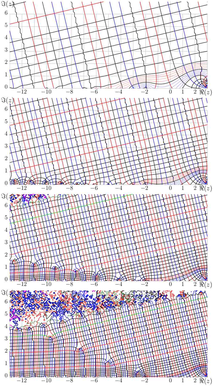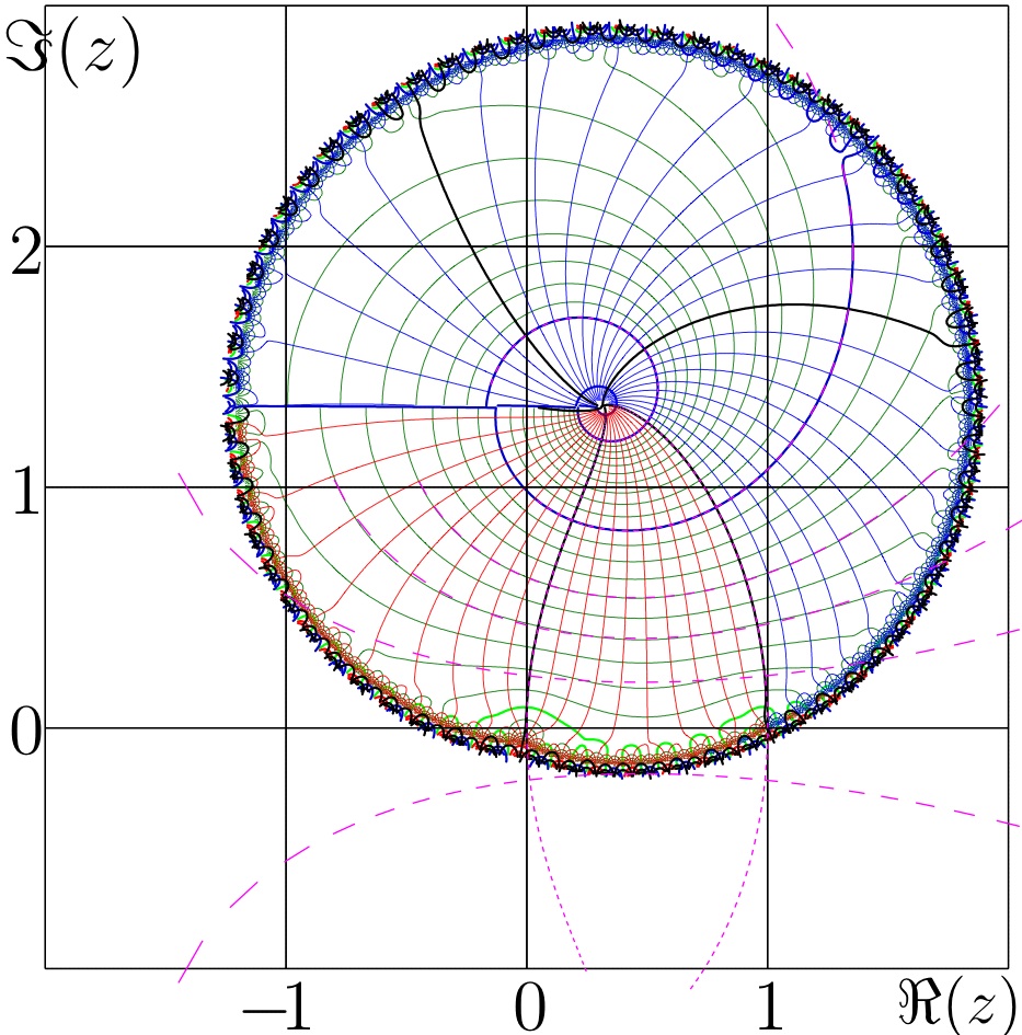 real slog developed at a fixed point - bo198214 - 11/29/2008 Following an idea of Dmitrii we make the ansatz: \( \text{slog}(z)=\frac{1}{\el}\left(\log(z-\el) + r(z-\el)\right) \) where \( \el \) is the fixed point of \( \log \) in the upper half plane and \( r \) is a powerseries developed at \( \el \). \( \text{slog} \) must satisfy: \( \text{slog}(\exp(z))=\text{slog}(z)+1 \) and hence: \( \log(e^z-\el)+r(e^z-\el)=\log(z-\el)+r(z-\el)+\el \) \( \log\left(\frac{e^z-\el}{z-\el}\right)=r(z-\el)-r(e^z-\el)+\el \) The left side has no singularity at \( \el \) hence we do the transformation \( z\mapsto z+\el \): \( \log\left(\frac{\el(e^z-1)}{z}\right)=r(z)-r(\el(e^z-1))+\el \) (*) \( \log\left(\frac{e^z-1}{z}\right)=r(z)-r(\el(e^z-1)) \) The left side can be developed as: \( \log\left(\frac{e^z-1}{z}\right)= \frac{1}{2}z+\frac{1}{24}z^2-\frac{1}{2880}z^4+\frac{1}{181440}z^6 -\frac{1}{9676800}z^8+\frac{1}{479001600}z^{10}+\dots \) Let \( \lambda_k \) be the coefficients of this series. And let \( \eta_k \) be the coefficients of the series \( \el(e^z-1)=\el z + \frac{\el}{2} z^2 + \frac{\el}{6} z^3 + \dots \). Then on the right hand side of (*) we have: \( (r-r\circ \eta)_n = r_n - \sum_{j=0}^n r_j (\eta^{\cdot j})_n \) by the composition rule for powerseries (Carleman matrix multiplication) where \( \eta^{\cdot j} \) means the \( j \)-th power (not iteration) of \( \eta \). This yields a recursive formula for \( r_n \): \( r_n(1-(\eta^{\cdot n})_n)=\lambda_n + \sum_{j=0}^{n-1} r_j (\eta^{\cdot j})_n \) Because \( \eta^{\cdot 0}=1 \) we can start the right hand sum at 1 instead of 0 if \( n>0 \), so: \( r_n = \frac{\lambda_n + \sum_{j=1}^{n-1} r_j (\eta^{\cdot j})_n}{1-(\eta^{\cdot n})_n} \) for \( n>0 \). Now we know that \( \eta^{\cdot j}(z)=\el^j (e^z-1)^j=\el^j\sum_{k=0}^j \left(j\\k\right)e^{kz}(-1)^{j-k} \) \( \left(\eta^{\cdot j}\right)_n=\el^j \sum_{k=0}^j \left(j\\k\right)\frac{k^n}{n!}(-1)^{j-k}=\el^j \sum_{k=1}^j \left(j\\k\right)\frac{k^n}{n!}(-1)^{j-k} \) So for example: \( r_1=\frac{\lambda_1}{1-\eta_1}=\frac{1/2}{1-\el} \) \( r_2=\frac{\lambda_2 + \eta_2}{1-(\eta^{\cdot 2})_2}=\frac{\frac{1}{24}+\frac{1}{2-2\el}\frac{\el}{2}}{1-\el^2(-1+2^2/2)}=\frac{\el}{{4 {\el}^{3} } - {4 {\el}^{2} } - {4 \el} + 4} + \frac{1}{24 - {24 {\el}^{2} }} \) \( r_3=\frac{\el}{{-12 {\el}^{6} } + {12 {\el}^{5} } + {12 {\el}^{4} } - {12 {\el}^{2} } - {12 \el} + 12} + \frac{{\el}^{2} }{{24 {\el}^{5} } - {24 {\el}^{3} } - {24 {\el}^{2} } + 24}+\frac{{\el}^{3} }{{-6 {\el}^{6} } + {6 {\el}^{5} } + {6 {\el}^{4} } - {6 {\el}^{2} } - {6 \el} + 6} \) RE: real slog developed at a fixed point - Kouznetsov - 12/03/2008 bo198214 Wrote:...Let \( f_1=\log(e^z-\el)-\log(z-\el) \) \( f_2=\log\left(\frac{e^z-\el}{z-\el}\right) \) Perhaps, it is supposed that \( f_1=f_2 \). I plot both functions below. Levels \( \Re(f)=-2,-1,0,1,2,3,4 \) are shown with thick black curves. Levels \( \Re(f)=-1.8,-1.6,-1.4,-1.2,-0.8,-0.6,-0.4,-0.2 \) are shown with thin red curves. Levels \( \Re(f)= 0.2, 0.4, 0.6, 0.8, 1.2, 1.4, 1.6, 1.8 \) are shown with thin red curves. Levels \( \Im(f)=-2,-1 \) are shown with thick red curves. Levels \( \Im(f)=1,2 \) are shown with thick blue curves. Levels \( \Im(f)=\pm \pi,\pm 3\pi \) are shown with thick pink curves. Levels \( \Im(f)=-4 \) is shown with cyan curve. Levels \( \Im(f)=-1.8,-1.6,-1.4,-1.2,-0.8,-0.6,-0.4,-0.2 \) are shown with thin red curves. Levels \( \Im(f)= 0.2, 0.4, 0.6, 0.8, 1.2, 1.4, 1.6, 1.8 \) are shown with thin red curves. RE: real slog developed at a fixed point - Kouznetsov - 12/07/2008 Dear Henryk. I already have expessed some doubts, but now I see, my misunderstanding begins even earlier. I do not understand even the title: how the slog can be real at the fixed point? On the other hand, I suggest the asymptotic development of sexp at large values of the imaginary part of the argument. Let \( \varepsilon=\varepsilon(z)=\exp(\el z +R) \), where \( \el \approx 0.3+1.3 i \) is fixed point of logarithm and \( R \) is some complex constant. Then, equation \( f(z+1)=exp(f(z)) \) allows the asumptotic expansion, using \( \varepsilon \) as small parameter: \( \mathrm{sexp}(z)=\sum_{n=0}^N a_n \varepsilon^n +\mathcal{O}(\varepsilon^{N+1}) \). The first coefficients of this expansion are: \( a_0=\el \), \( a_1=1 \), \( a_2=\frac{1/2}{\el-1}\approx -0.151314 - 0.2967488 \mathrm{i}~,~ \) \( a_3=\frac{a_2+1/6}{\el^2-1}\approx -0.36976 + 0.98730 \mathrm{i} \) \( a_4= a4=(a2/2.+a_2^2/2.+a_3+1./24.)/(\ell^3-1.) \approx 0.025811 -0.017387 i \). I evaluate the parameter \( R\approx 1.077961437527-0.946540963949 i \), fitting tetration sexp at large values of the imaginary part, with the approximation at \( N=4 \). I plot the deviation of tetration from the asymptoric approximation with \( N=0,1,2,3 \) in the figiures below. The four plots correspond to the four asumptotic approximations. The deviations \( f=\mathrm{slog}(z)-L \), \( f=\mathrm{slog}(z)-\Big(L+\varepsilon(z)\Big) \), \( f=\mathrm{slog}(z)-\Big(L+\varepsilon+a_2 \varepsilon^2 \Big) \), \( f=\mathrm{slog}(z)-\Big(L+\varepsilon+a_2 \varepsilon^2 + a_3 \varepsilon^3\Big) \) are shown in the complex plane with lines of constant phase and constant modulus. Levels \( \arg(f)=-2,-1 \) are shown with thick red lines. Level \( \arg(f)=0 \) is shown with thick black lines. Levels \( \arg(f)=1,2 \) are shown with thick blue lines. Levels \( \arg(f)=\pm \pi \) are shown with scratched lines. (these lines reveal the step of sampling used by the plotter). Levels \( |f|=\exp(-0. ,\exp(-0.6),\exp(-0.4),\exp(-0.2) \) are shown with thin red lines.Levels \( |f|=\exp(0.2),\exp(0.4),\exp(0.6),\exp(-0. \) are shown with thin blue lines.Levels \( |f|=\exp(3), \exp(2), \exp(1),\exp(0), \exp(-\!1), \exp(-\!2), \exp(-\!3), \exp(-\!4), \exp(-\!5), \exp(-\!5), \exp(-\!7), \exp(-\! \) are shown with thin thick black lines.Level \( |f|=\exp(-10) \) is shown with thick red line. Levels \( |f|= \exp(-12),\exp(-14), \exp(-16),\exp(-1 \) are shown with thick 