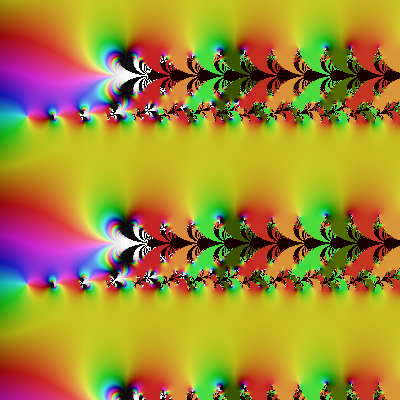 Additionally here is a complex plot of \(\beta(z)\) which is the asymptotic solution that is \(2 \pi i\) periodic. The orange area is the good well behaved area, the black and white essentially means we have more chaos, and the superfunction will be more poorly behaved here. This is over \(|\Im(z)| < 7.5\) and \(0 < \Re(z) < 15\).
