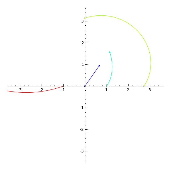 The second exponentiation gets to pi*i, and is show in a sort of yellow-green hue. Finally, the third exponentiation gets to -1, and is shown in red.
