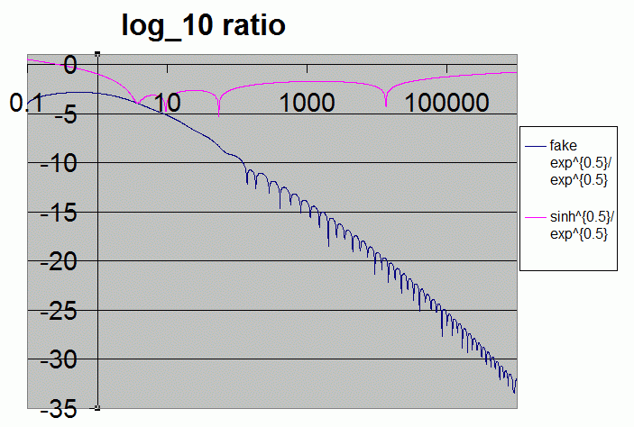 (09/12/2014, 06:35 PM)tommy1729 Wrote: How does the difference between fake_exp^[0.5](z) and Kneser_exp^[0.5](z) look like ?Below, is a log_10/log_10 plot of both ratios, from 0.1 to 10^6. The fakeexp asymptotic is accurate to >30 decimal digits at 10^6, using only 55-60 terms. btw, there is also a pretty good asymptotic for sinh^{0.5}, almost as good as the one for exp^{0.5}. Tommy might have been interested in sinh(z)/exp(z) which converges exponentially to '1', much quicker than the fakeexp converges.
