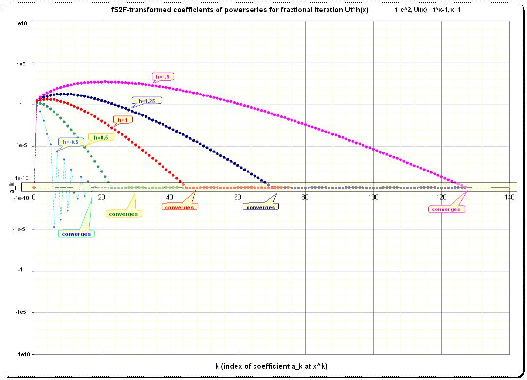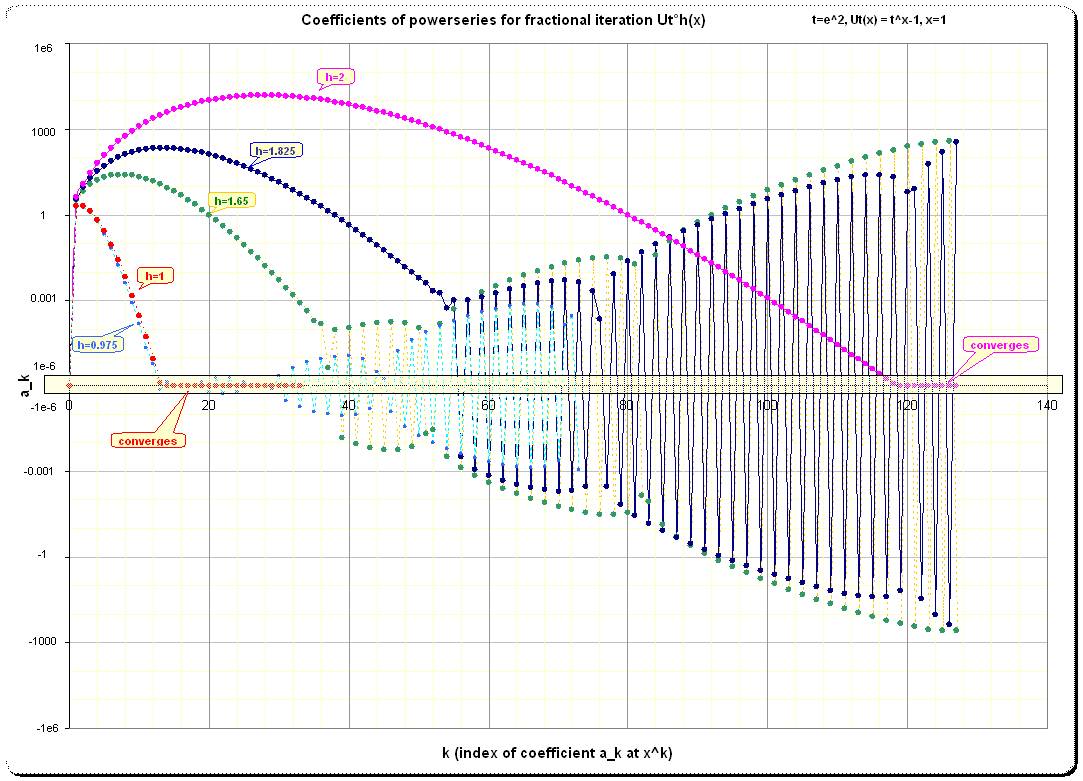 a) first simply compare the numerical values of the coefficients of some fractional iteratives, up to index 64 or 128. It shows, that for fractional iteration heights the index \( k \) of coefficients from where on the coefficients begin to diverge (let's call this \( \kappa \) ), moves to a small value when \( h \) moves from integer to half-integer height. It allows the surprising formulation, that the iteration with integer \( h \) simply moves \( \kappa \) to infinity, or \( \lim_{\text{frac} (h) \to 0} \kappa = \infty \) .