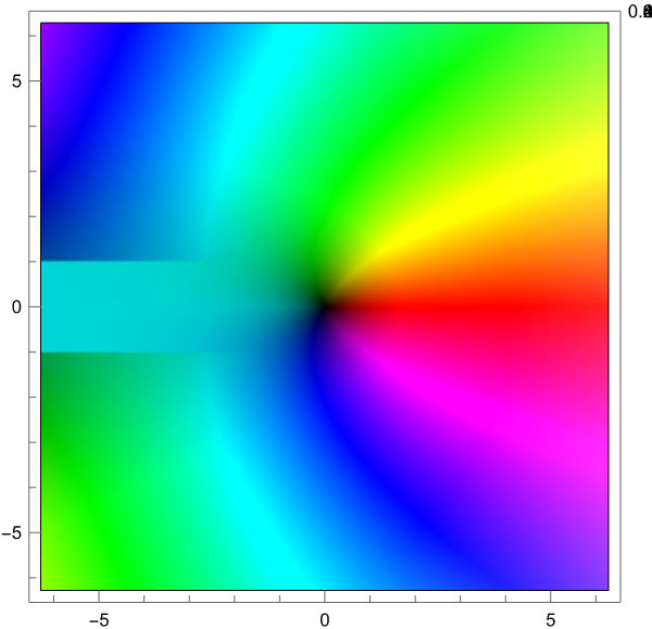 Here's a complex plot of f(z), showing its holomorphity. I defined a artificial branch cut at \(Re(z)<0 \wedge Im(z)=\pm1\) and a 2D real-to-real plot