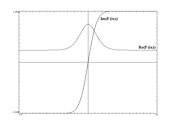 If we try it now at the natural base, base \( e \), we get \( ^{1/2} e \approx 1.64635\ \mathrm{to}\ 1.64636 \), which agrees with the results from the Cauchy integral, the Abel iteration, Kneser iteration, etc. Indeed, if we look at the graph at the imaginary axis, we see this: