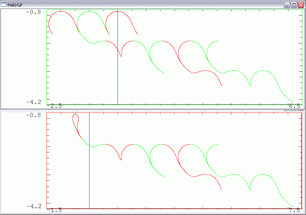Going back to the theta(z)+z contour, now I fill in the detail, getting superexponentially closer and closer to the singularity at sexp(z=-1)=0. The earlier plot above approached to within sexp(z)=1.6E-78. In green, the first extension goes 1/sexp(3.5) to 1/sexp(4.5). For comparison, a googolplex is roughly sexp(4.53). But the detail increases as we superexponentially approach zero. The next extension, in red goes from 1/sexp(4.5) to 1/sexp(5.5). Sexp(5.5) is a number too larger to meaningfully describe. The next extension, in green, goes from 1/sexp(5.5) to 1/sexp(6.5). And the next extension, in red goes from 1/sexp(6.5) to 1/sexp(7.5). And finally, in green 1/sexp(7.5) to 1/sexp(8.5). I used superexponential approximations to calculate these plots, which was actually quite a difficult calculation! Underneath, is the exact corresponding theta(z) plot. Notice that theta(z) function will slowly approach +real infinity, and -imag infinity, as the function superexponentially approaches the singularity at zero. Also, notice that the singularity becomes ever more and more complicated, winding and unwinding along repeated paths superexponentially close to paths that it has already followed.