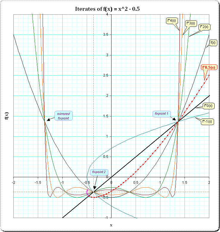 a) an overview. Integer iterates f°-1(x), f°0, f°1,f°2, f°3,f°4 and the regular f°0.5 iteration based on the powerseries representation
