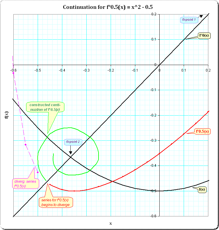 Looking at the winding of f°0.5(x) at the second fixpoint and in contrast at the straight line at first fixpoint gives an idea for an explanation for another problem. I was always wondering, why the alternating series of consecutive iterates gives matching results for the serial summation and the matrix-computed summation in one direction and not in the other.