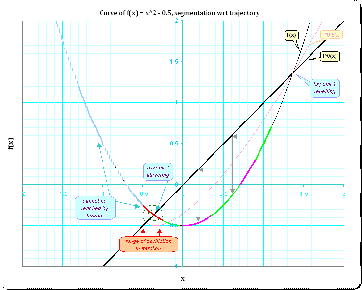 The light-blue segment of the f(x)-curve cannot be reached from any segment on the right; the iteration-"source" is imaginary. This answers the also the continuation of the f°0.5(x)-curve: it must (re-)appear in the complex plane.